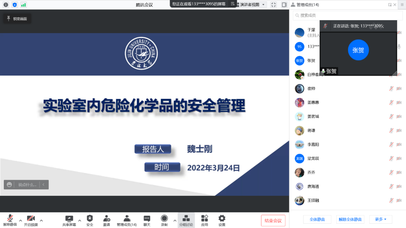 化学国家级实验教学示范中心副主任魏士刚为学院2021级硕士、博士研究生带来精彩的实验室危险化学品安全管理线上专题讲座。讲座由副院长张贺主持。