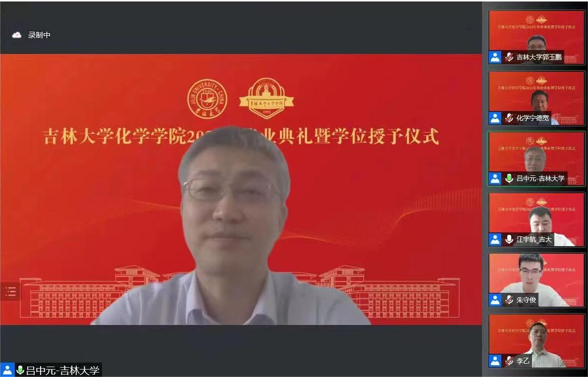 风好正是扬帆时,劈波斩浪再出发。毕业典礼上,院长吕中元教授回顾了与毕业生同学们通过“院长面对面”等活动交流、研讨的美好时光。临别之际,他以学科创建70年中,一代代化学人艰苦创业、皓首穷经、改革创新、服务国家的感人故事激励毕业生同学。希望他们做爱国报国、矢志奋斗、敢于创新的吉大化学人,无论走到哪里都能把为学、为人的品格传承下去,做行业骨干、青年先锋,无论是“顺流”或是“逆流”都能够坚守本心,成为祖国建设的有用之才、栋梁之才。吕中元向全体毕业生发出邀请:随时欢迎你们回到吉大化学这个家,穿上属于自己的学位服,再来留恋一回、惜别一回、深情一回。