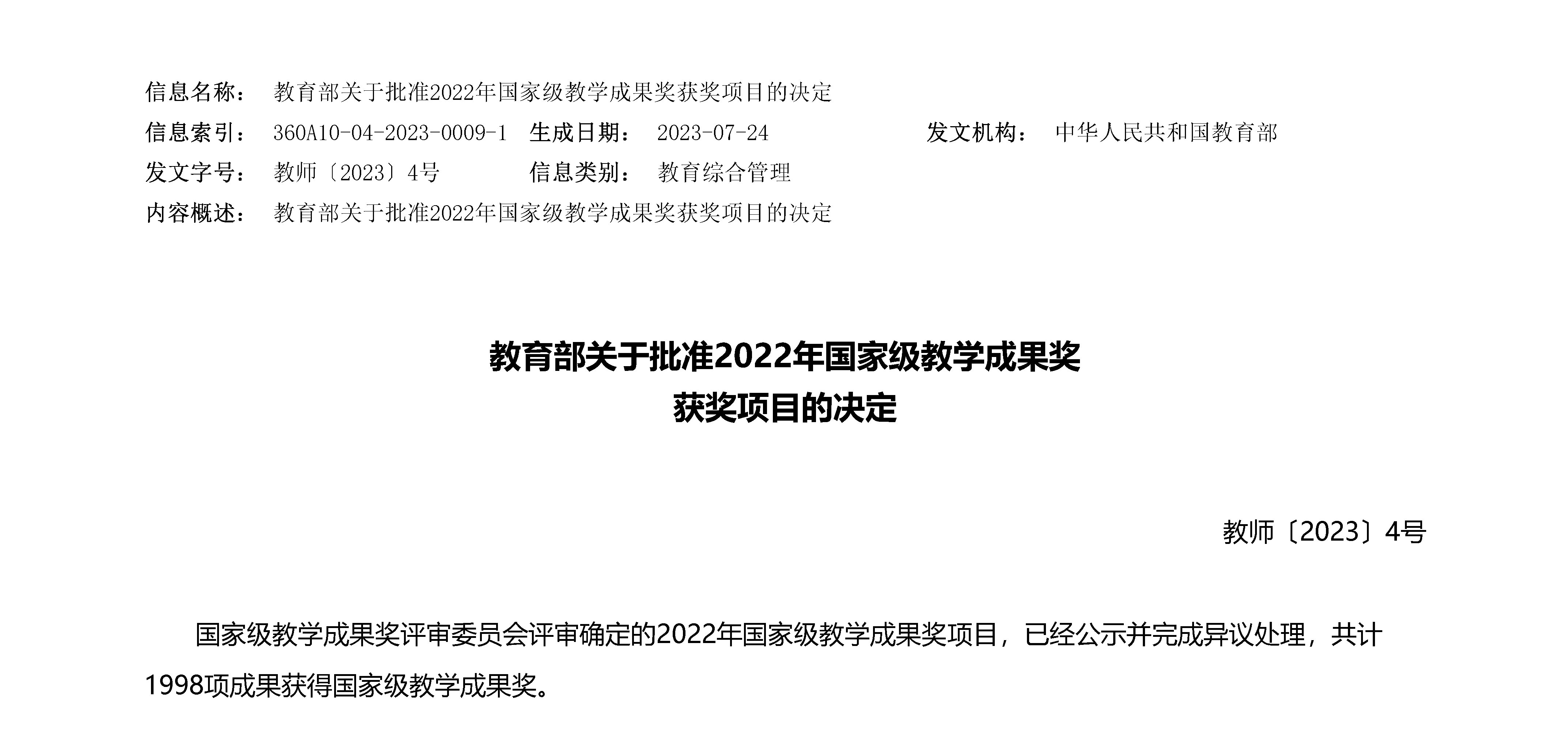 近日,《教育部关于批准2022年国家级教学成果奖获奖项目的决定》(教师〔2023〕4号)公布。第一会所