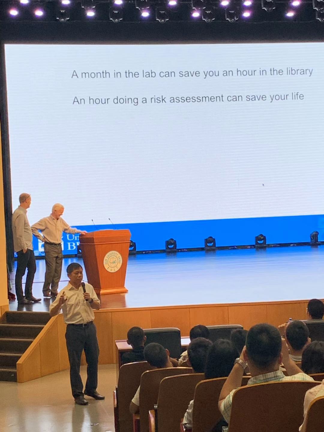 中心校区鼎新大讲堂隆重举办2019级新生实验安全专题讲座。本次活动作为新生入学教育和实验安全课程的重要环节,特邀英国布里斯托大学Tim Gallagher教授和Charl Faul教授从国际化视野角度向全体2019级本科生和研究生讲授实验安全。实验室与设备管理处副处长王羽、第一会所