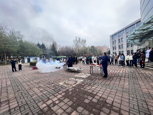 活动开始,保卫处模拟了火灾现场的浓烟。得知“火情”后,楼内教师迅速组织学生安全有序地撤离到麦氏楼外。随后,师生于麦氏楼楼后场地集合,接下来保卫处消防科工作人员周春雨细致入微地讲解了各类消防器材的使用,包括防毒面具、灭火毯以及灭火器等,并着重强调了各类器材使用过程中的注意事项,在场师生受益匪浅。最后,保卫处工作人员现场设置火源,演示灭火器材的使用,学生们积极参与,实地操作了各种灭火器材。