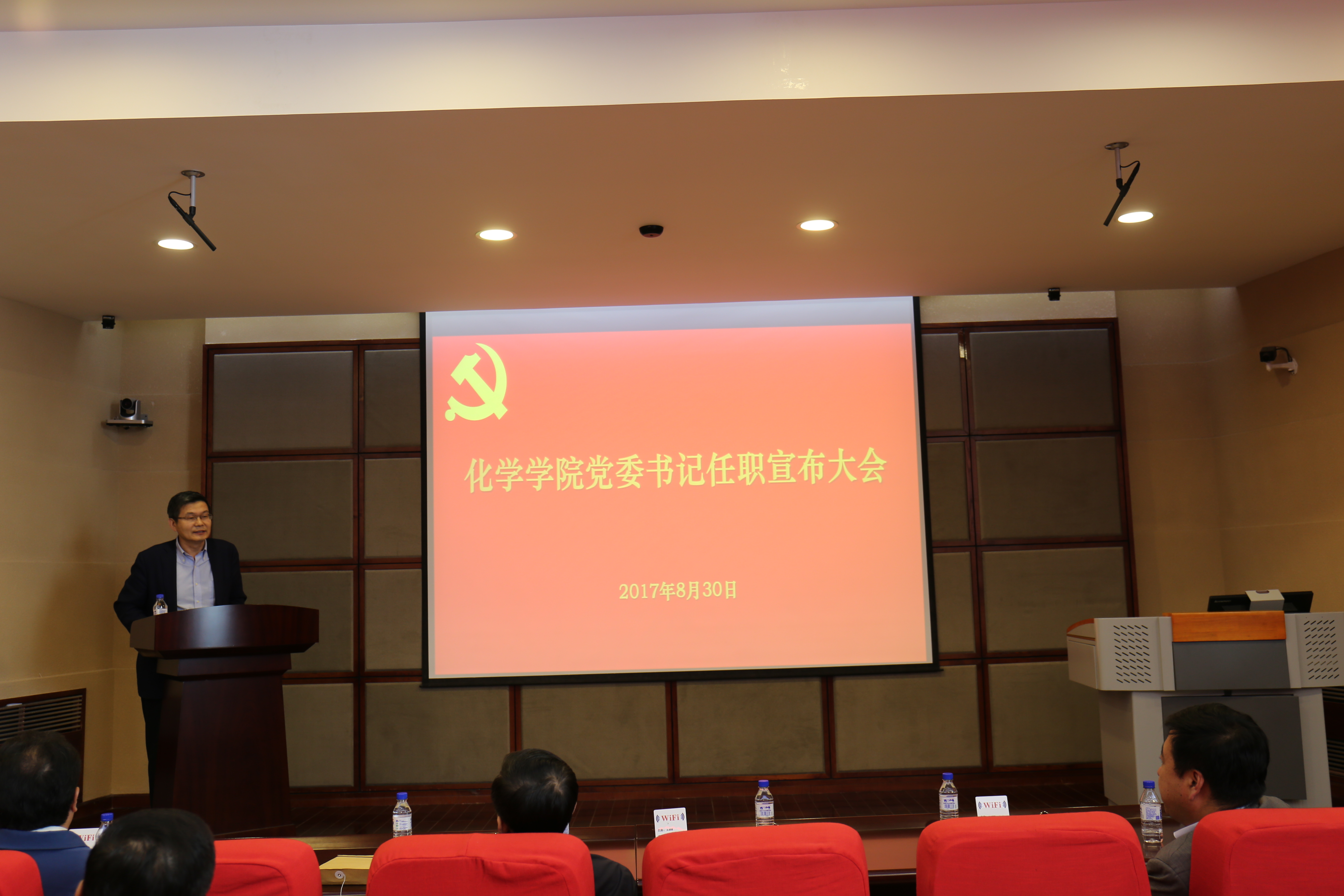 在唐敖庆楼A408会议室召开党委书记任职宣布会。副校长郑伟涛教授、校党委组织部部长边铁出席会议,学院党政领导班子成员,党委委员,纪委委员,学术委员会、学位委员会和教学委员会主任委员,无机合成与制备化学国家重点实验室、超分子结构与材料国家重点实验室、特种工程塑料教育部工程研究等科研机构正副职,各系所中心主任,教工党支部书记和机关各办公室主任参加了会议。会议由学院院长孙俊奇主持。
