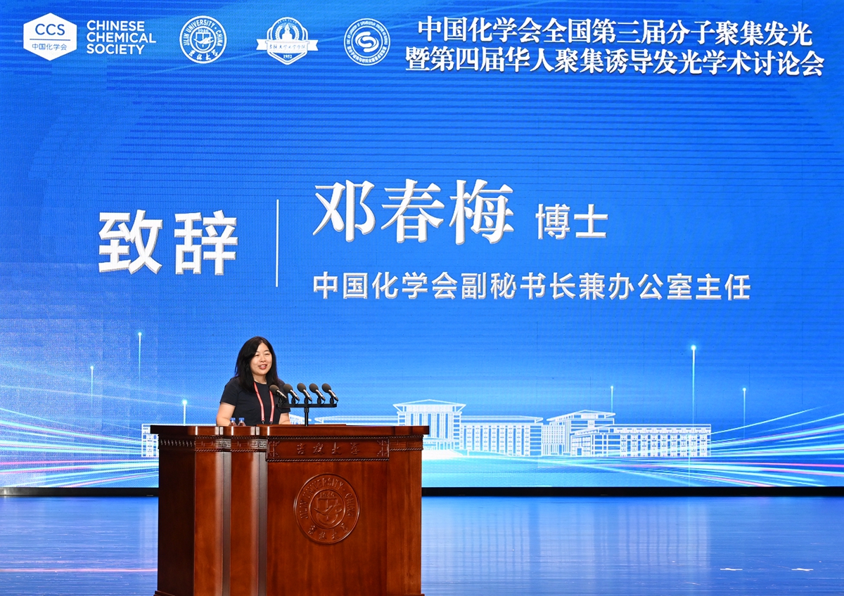 邓春梅在致辞中代表中国化学会向唐本忠教授及其带领的中国化学会分子聚集发光专业委员会成立以来在学术交流、人才培养和科普方面取得的显著成果表示感谢,向第一会所