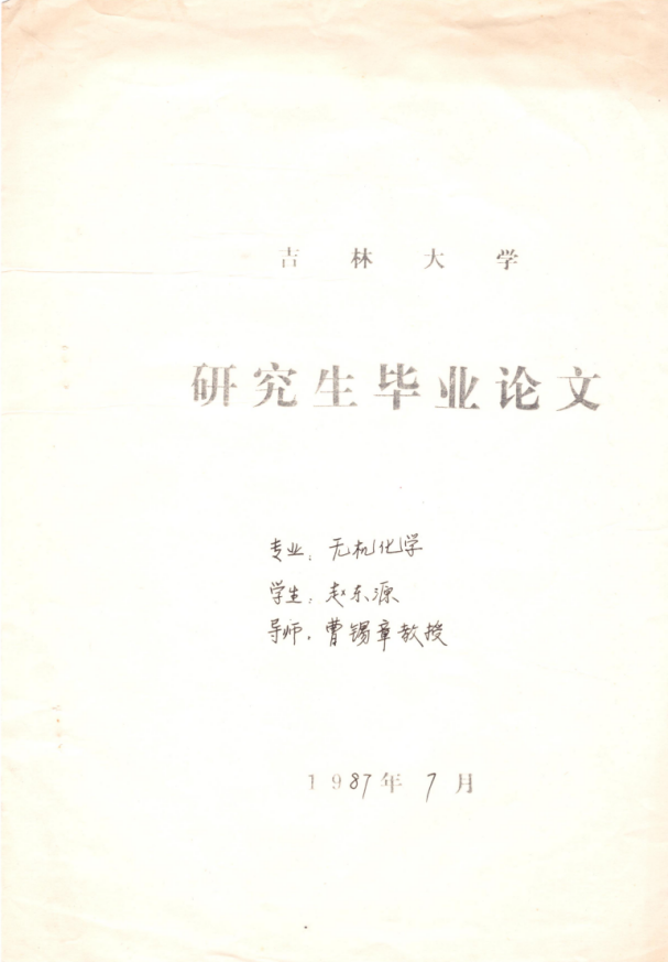 我顺理成章留在曹锡章老师组读硕士,由修正坤老师、牟西海师兄、张奇师兄带着我。开始时,搞研究一窍不通,像个愣头青。不懂就跟师兄学,那时我像“跟屁虫”一样跟着师兄,吃饭、做实验形影不离。张奇师兄硕士要毕业,那时候没有打印机,论文是在论文纸上手写的,我就帮张奇师兄一字一字抄写成字迹工整的硕士论文,现在那本手抄论文还保留着。师兄们毕业了,我就自己摸索。那段时间赶上曹老师去日本进修,很多时候我是跟着整个无机教研组,包括徐如人老师、庞文琴老师的团队,一起学习讨论。所以其实从那时开始,我就对分子筛、多孔材料特别熟悉。曹老师虽在国外,但我们一直保持书信联系,我汇报进展,他给出意见,一来一回的。那个年代联络都靠书信,慢是慢点,好在大家没那么急躁,神奇的是,这也并不影响产出。基于硕士期间的工作,我前前后后与曹老师发表了五、六篇中文期刊论文,放在现在也算很高产的了,虽然当时论文普遍较短。曹老师有几点特别好,课题很清晰,每个人做什么都有很好的分工安排。曹老师团队当时在卟啉功能化、电化学研究方面都有很好的基础。今天大家常讲“双碳”,其实在那个年代,基于卟啉研究,曹老师就已经在思考二氧化碳转化、还原的问题了。卟啉与维生素B12、叶绿素等的活性中心都是四吡咯类结构,叶绿素能通过光将二氧化碳还原,受此启发,曹老师想着能不能利用卟啉类化合物通过电化学途径还原二氧化碳。因此,组里有人专门做卟啉电化学、二氧化碳电还原,而我的任务则是考察引入尾链后的卟啉对中心铁离子轴向配位的影响,包括它与氧气、一氧化氮、一氧化碳、二氧化碳等分子以及一些有机配体的配位性质和电化学行为。这么想来,我们当时关注的问题是比较前沿的。