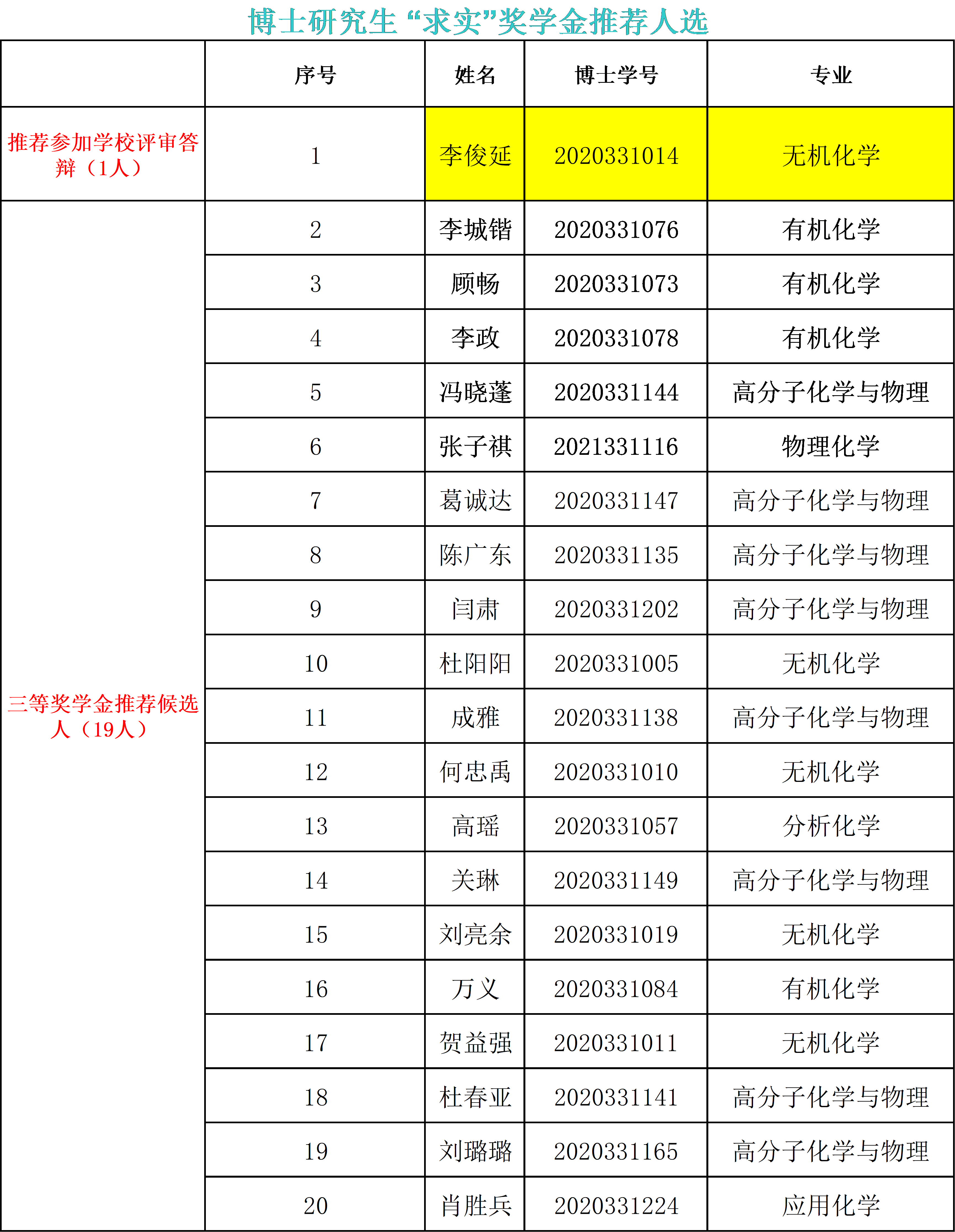 依据《第一会所 博士生“求实”奖学金评选办法》要求,第一会所 采取研究生个人申报、导师推荐、学院研办审核材料、评审工作小组初评推荐、第一会所 研究生奖学金评审委员会审核确定的方式进行评定,现拟推荐1名博士李俊延(2020331014))参加学校评审答辩,竞争一等、二等“求实”奖学金;拟推荐李城锴等19名博士为 “求实”奖学金三等奖候选人(名单见附件),如有问题请联系赵晓杰老师,电话13504470223。
