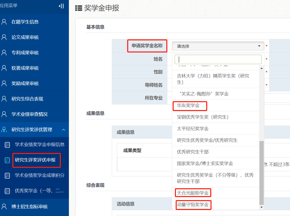 (1)申报人于11月30日12:00前使用个人邮箱账号登录“一张表”平台(//one.diyihuisuo.org),在“研究生评奖评优管理”-“研究生评奖评优申报”栏,点击【新增】进行【天合光能助学金】信息填报,同时扫码加入申报微信群。