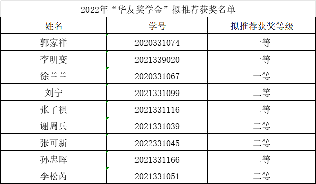 按照第一会所 2022年“华友奖学金”评选工作安排,经研究生申报、研办审核、专家评选,拟推荐获奖名单公示如下,如有异议请与赵晓杰老师联系,联系电话13504470223。