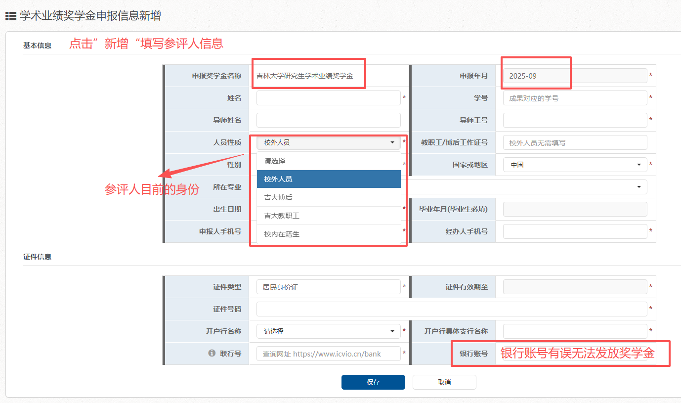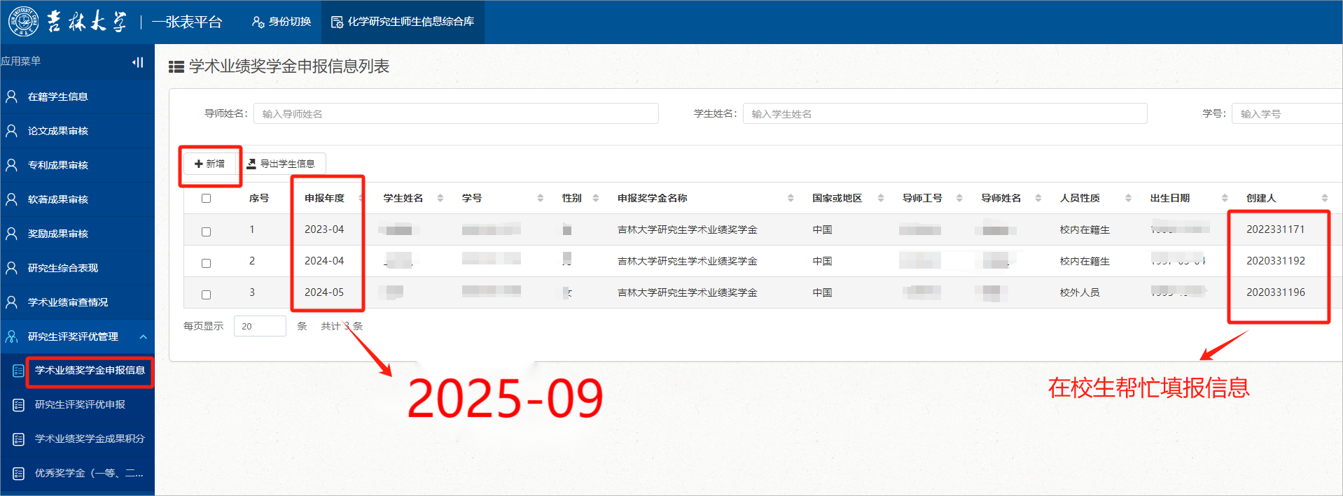 1. 使用个人邮箱账号登录“一张表”平台(//one.diyihuisuo.org),在“研究生评奖评优管理”- “学术业绩奖学金申报信息”栏点【新增】进行申报人及银行卡信息填报。请申报人务必认真填写和核实银行卡等相关信息,确保准确无误,保证获奖者奖学金及时发放。已毕业研究生可由在校生帮忙代填。