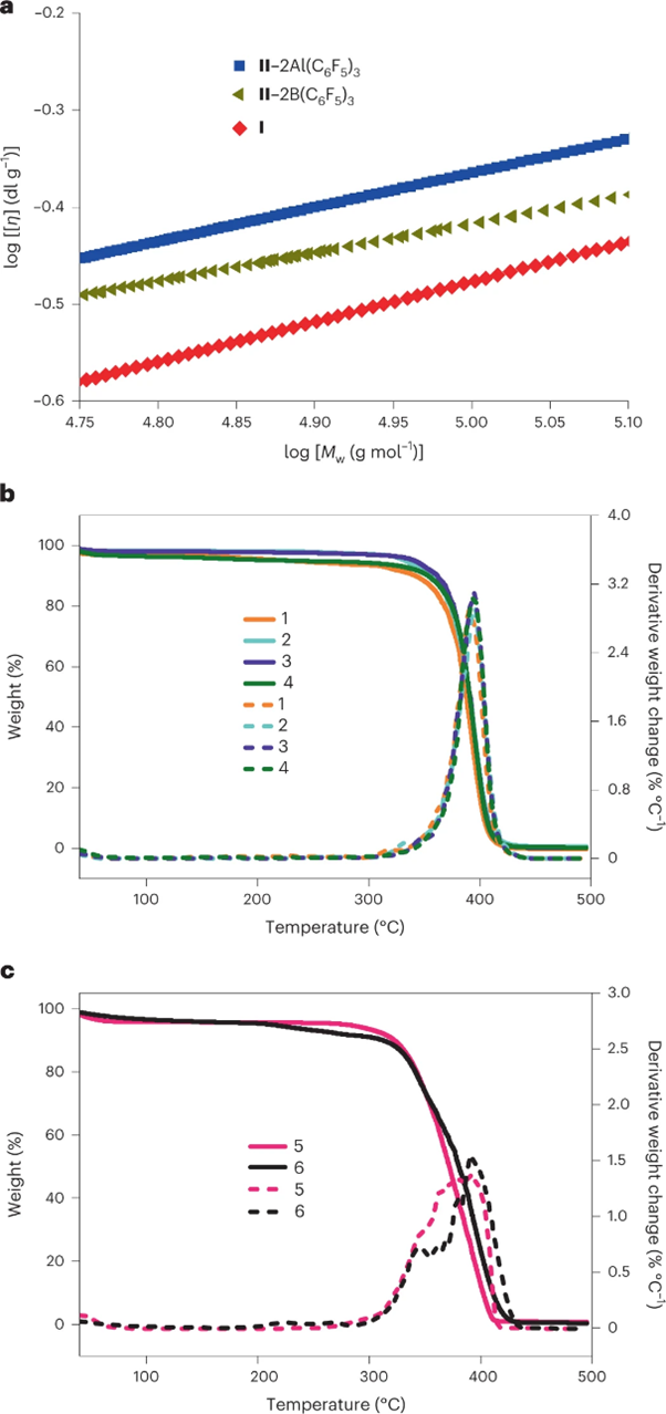 图6 a,不同拓扑结构的PMMBL的特性粘度比较,如Mark–Houwink图所示:由FLP I产生的c-PMMBL,由分子间 II–2B(C6F5)3 产生的环状和线性PMMBL混合物,以及由分子间LPII–2Al(C6F5)3制备的l-PMMBLb,具有四种不同MWsc-PMMBL样品的TGA(实线)和DTG(虚线)曲线叠加:sample 1, Mn = 93.1 kg mol–1, Đ = 1.31; sample 2,  Mn = 109 kg mol–1,  Đ = 1.21; sample 3,  Mn = 176 kg mol–1,  Đ = 1.41; sample 4,  Mn = 403 kg mol–1,  Đ = 1.88. c,两种不同MWsl-PMMBL样品的TGA(实线)和DTG(虚线)曲线叠加图:sample 5,  Mn = 289 kg mol–1,  Đ = 1.82;  sample 6,  Mn = 427 kg mol–1,  Đ = 1.77.
