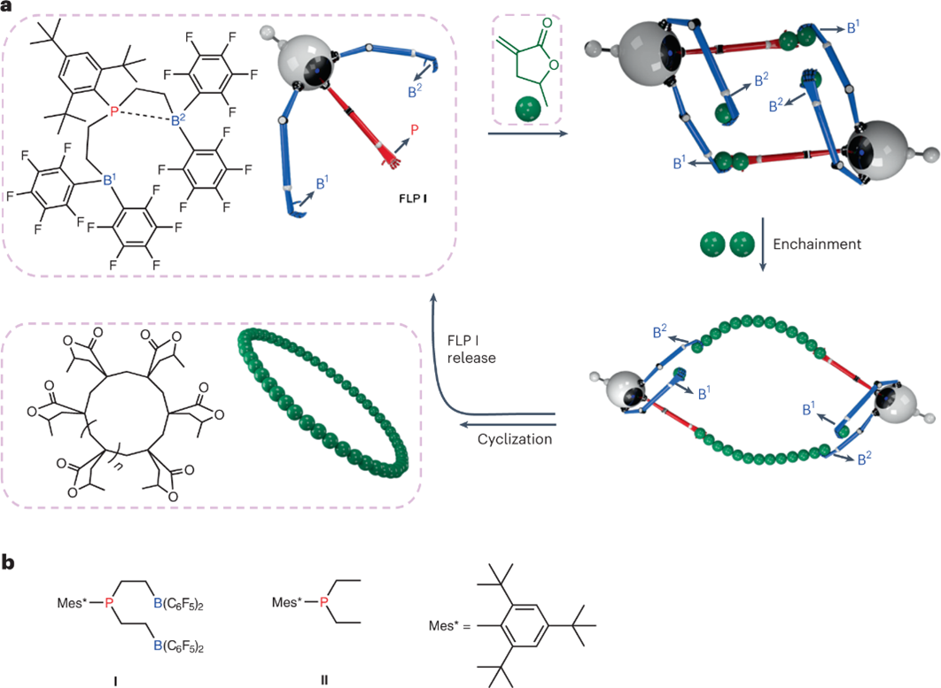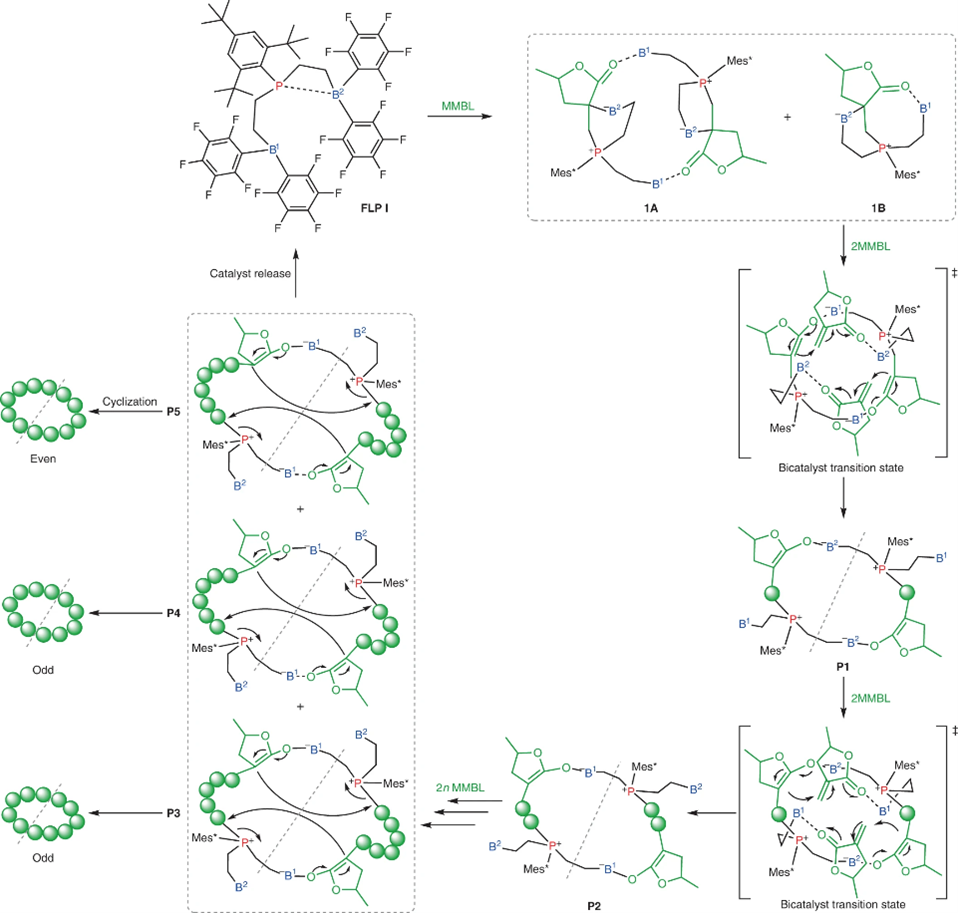 针对上述问题,作者开发了一种B-P-B三官能FLP催化剂(图1b),催化环状丙烯酸酯单体MMBL以双分子协同、单体成对插入的方式进行链增长,最后两条链的ω端进攻另一条链的α端得到完全由单体构成的环状聚合物(图1a)。