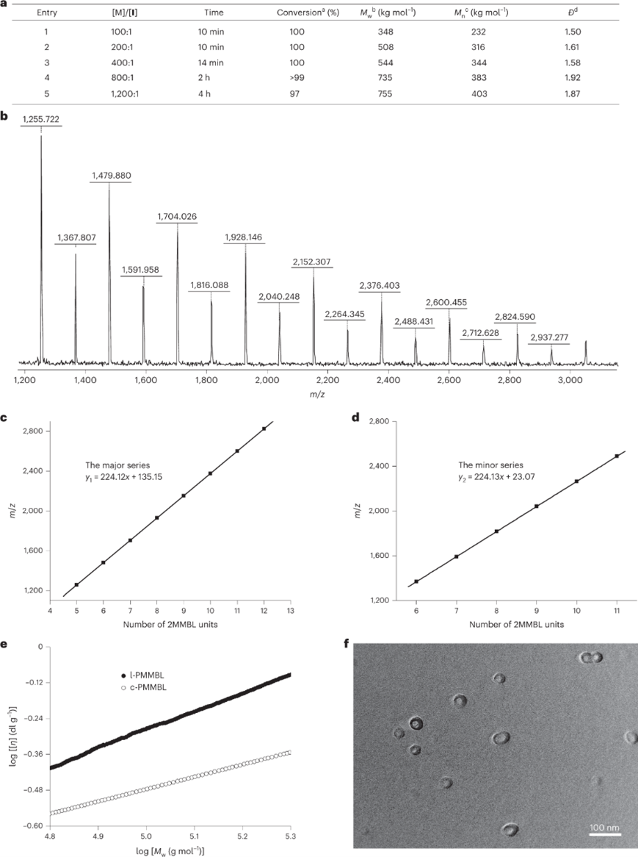 图2  a, 表中显示了室温(~25℃)下由MMBLFLP IDCM中制备的PMMBL的选定聚合数据[M]0 = 0.936 M. a通过1H NMR光谱测定单体转化率。b使用光散射检测器通过GPC测量绝对重均分子量(Mw)。cMn Mw/Đ计算得出. dĐ = Mw/Mn. b, FLP I.制备的MMBL低聚物的MALDI-TOF MS谱,c,db中分子离子的主要(c)和次要(d)系列的m/z2MMBL重复单元数量的关系图。el-PMMBLc-PMMBL的特性粘度的比较,为用IAP–Al(C6F5)3 制备的l-PMMBL和用I制备的c-PMMBLMark–Houwink图。f,  c-PMMBL50-ran-PVMBL50-g-PEG2000TEM图像。