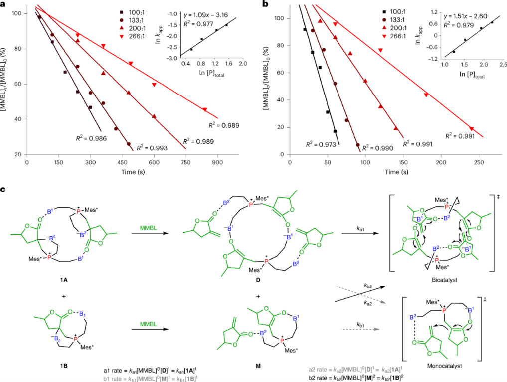 对聚合过程的研究表明,FLP1MMBL的化学剂量反应生成了约等摩尔比的环状双分子产物1A和环状单分子产物1B(图3a),其中1A得到了晶体结构的明确表征(图3b)。单独采用1A1B的混合物进行聚合试验,得到的聚合物结构完全相同。作者进一步对动力学进行研究(图4ab)。首先单独使用1A的动力学显示(图4a),反应相对于1A表现为一级动力学,说明1A聚合反应式按照ka1的途径进行。而使用1A1B的混合物催化聚合时,相对于催化剂中Lewis碱的总量动力学显示为1.5级(图4b),这说明聚合过程中1B必须采用kb2的途径进行才能实现,也就是说虽然催化剂转化成了1A1B的混合物,但两者在聚合时都要以双分子协同方式进行链增长。