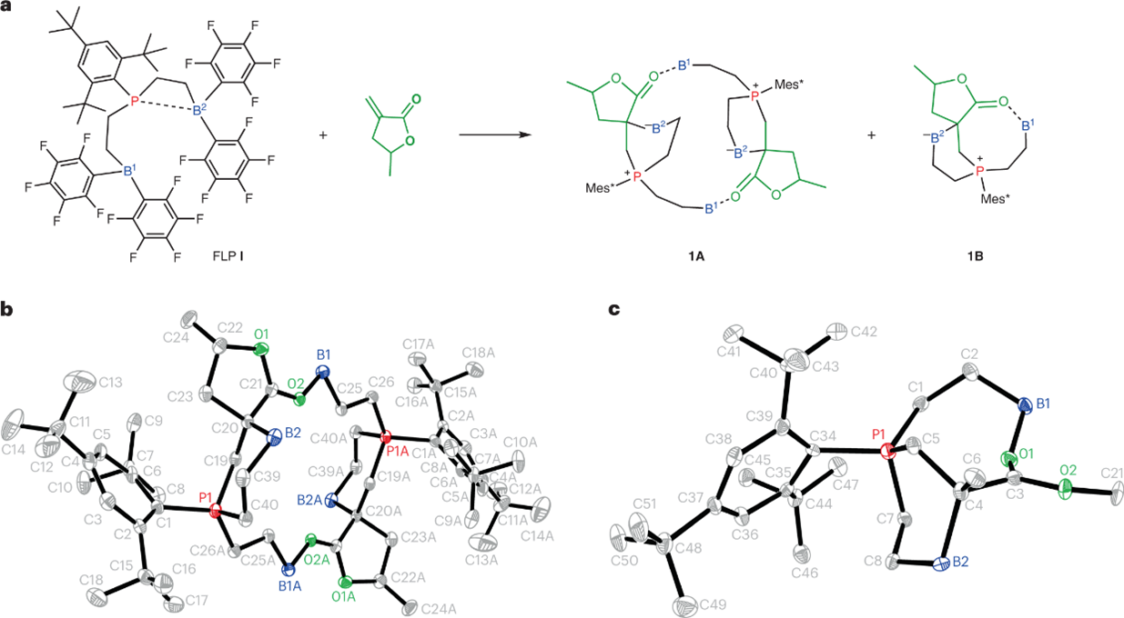 图3 aFLP IMMBL的反应分别提供环状双分子和单分子中间体1A1B。为了清楚起见,这两个B原子被指定为B1B2b,环状双分子中间体1AX射线晶体结构。c, 环状单分子中间体2B(由FLP IMMA的反应生成)的X射线晶体结构,其是环状单分子1B的模型。