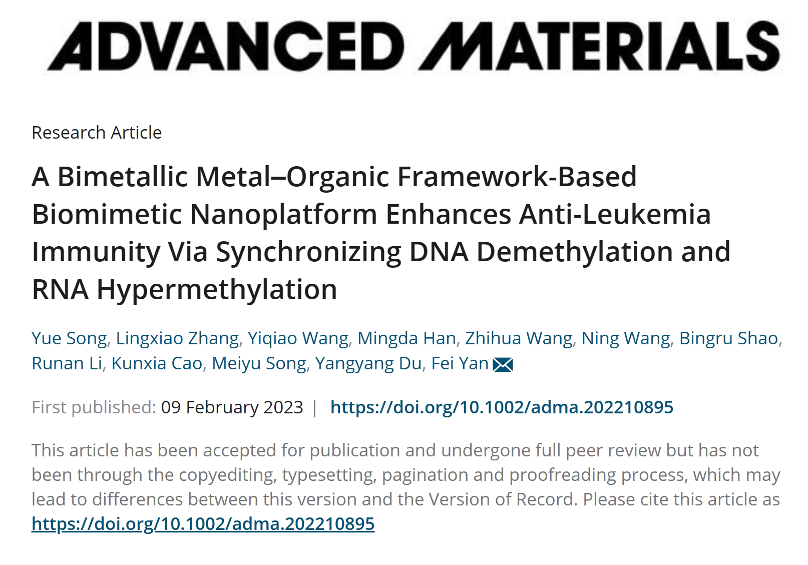 无机合成与制备化学国家重点实验室闫飞课题组提出一种纳米表观治疗新策略,并以“A Bimetallic Metal–Organic Framework-Based Biomimetic Nanoplatform Enhances Anti-Leukemia Immunity via Synchronizing DNA Demethylation and RNA Hypermethylation”为题发表在Advanced Materials上。第一会所