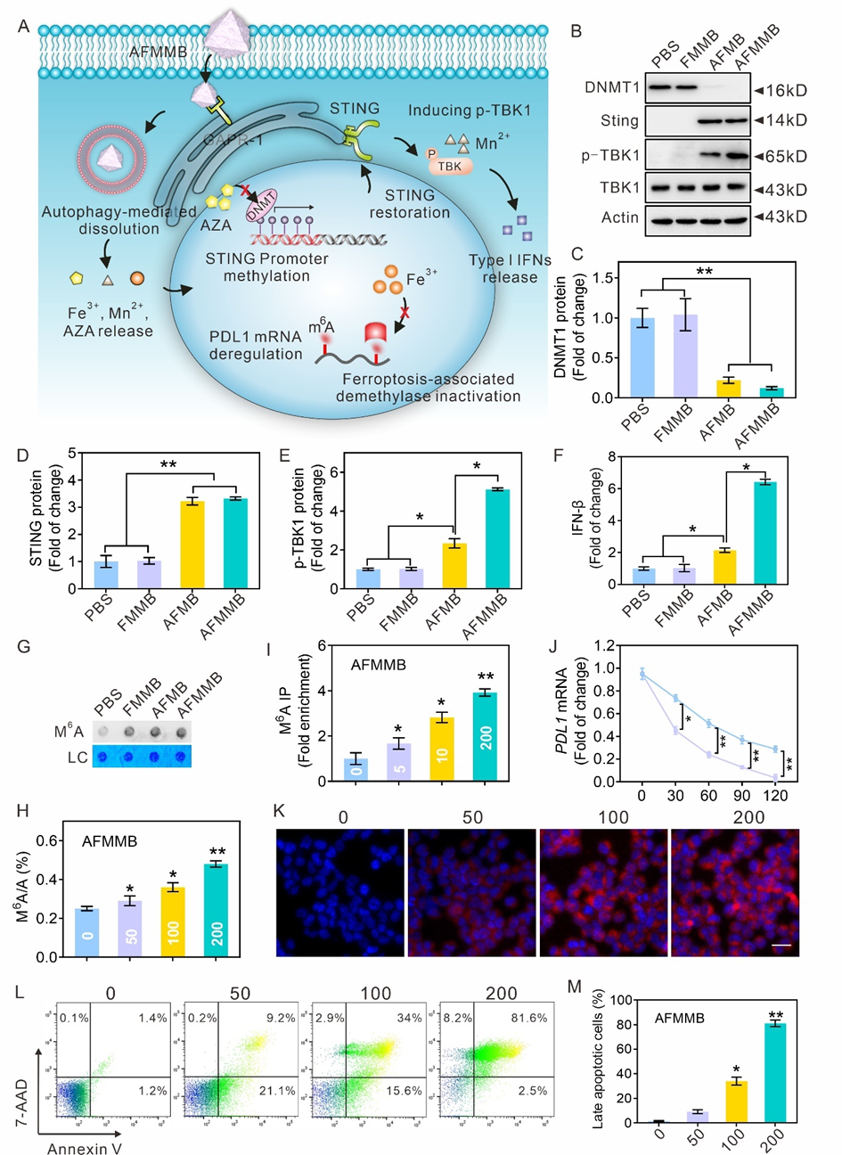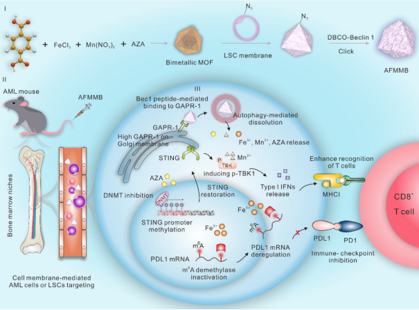 课题组构建了一种基于金属有机骨架(MOF)的双金属仿生纳米平台(AFMMB),该平台由DNA去甲基化酶抑制剂、白血病干细胞(LSCs)膜和促自噬肽(Beclin-1)组成。由于LSC膜的归巢效应和免疫相容性,AFMMB纳米颗粒可同时靶向白血病细胞(LBs)和白血病干细胞,并通过与高尔基体中的GAPR-1蛋白结合来诱导自噬。自噬引发AFMMB降解释放出小分子抑制剂(AZA)、Mn2+和Fe3+,其中,AZA和Mn2+通过抑制DNA甲基化来恢复STING通路,从而增加MHC-I分子的表达。而Fe3+的积累使内源性铁依赖的m6A去甲基化酶失活,从而增加整体m6A RNA修饰并抑制PD-L1转录稳定性。这种双重表观遗传作用通过上调MHC-I分子和下调PD-L1,增强了AML细胞的免疫原性,从而增强了毒性T细胞对肿瘤细胞的识别和杀伤能力(图1)。
