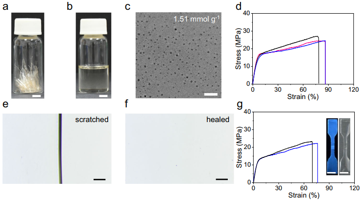 将纳米粒子组装成具有高机械强度、可加工性和可回收性的宏观材料是材料科学和纳米技术领域的一项重要且具有挑战性的任务。作为一种新兴构筑基元,碳点具有很多优异的性质,利用其为基元组装成为宏观材料不仅会继承碳点的优良性能,并将产生新兴的耦合性能。