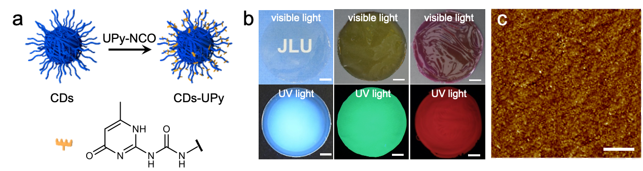 图1. a,碳点构筑基元示意图,b,宏观膜材料照片,c,AFM图片。