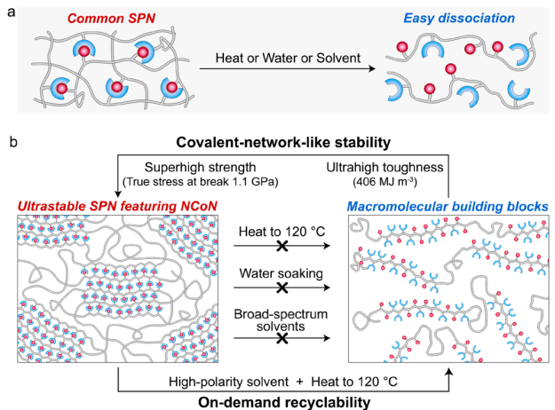 自20世纪70年代超分子化学的概念诞生以来,分子与分子之间基于非共价键的超分子组装已经成为创制跨尺度新物质与新材料的重要手段,跨越了从微纳米尺度的分子组装体到宏观尺度的超分子聚合物材料。超分子聚合物网络(supramolecular polymer networks,SPNs)是共价聚合物基于非共价键组装/交联所形成的三维聚合物网络。得益于动态可逆的非共价键,SPNs因网络可重构特性具有可重复加工、可修复、刺激响应等独特功能。因此,SPNs在可循环利用及智能材料领域展现出巨大的应用潜力。然而,非共价键的环境(温度、水、溶剂)敏感性使SPNs表现出较差的稳定性(如热稳定性、耐水性、耐溶剂性等),极大地限制了SPNs作为超分子聚合物材料的实际应用。所以,解决SPNs稳定性差的问题是超分子化学领域的重要难题。
