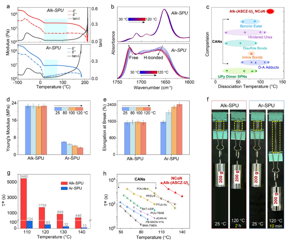 得益于NCoN中氢键的多重协同性,Alk-SPU表现出极佳的热稳定性,其解离温度高达120 °C,远远高于基于UPy氢键二聚体形成的SPNs的解离温度(最高报道值为80 °C),同时也高于典型的动态共价网络(CANs,如基于DA键形成的CANs)。即使在加热到120 °C的高温下,Alk-SPU弹性体的杨氏模量和断裂伸长率几乎没有下降,因此在高温下仍然呈现出优异的抗蠕变性。