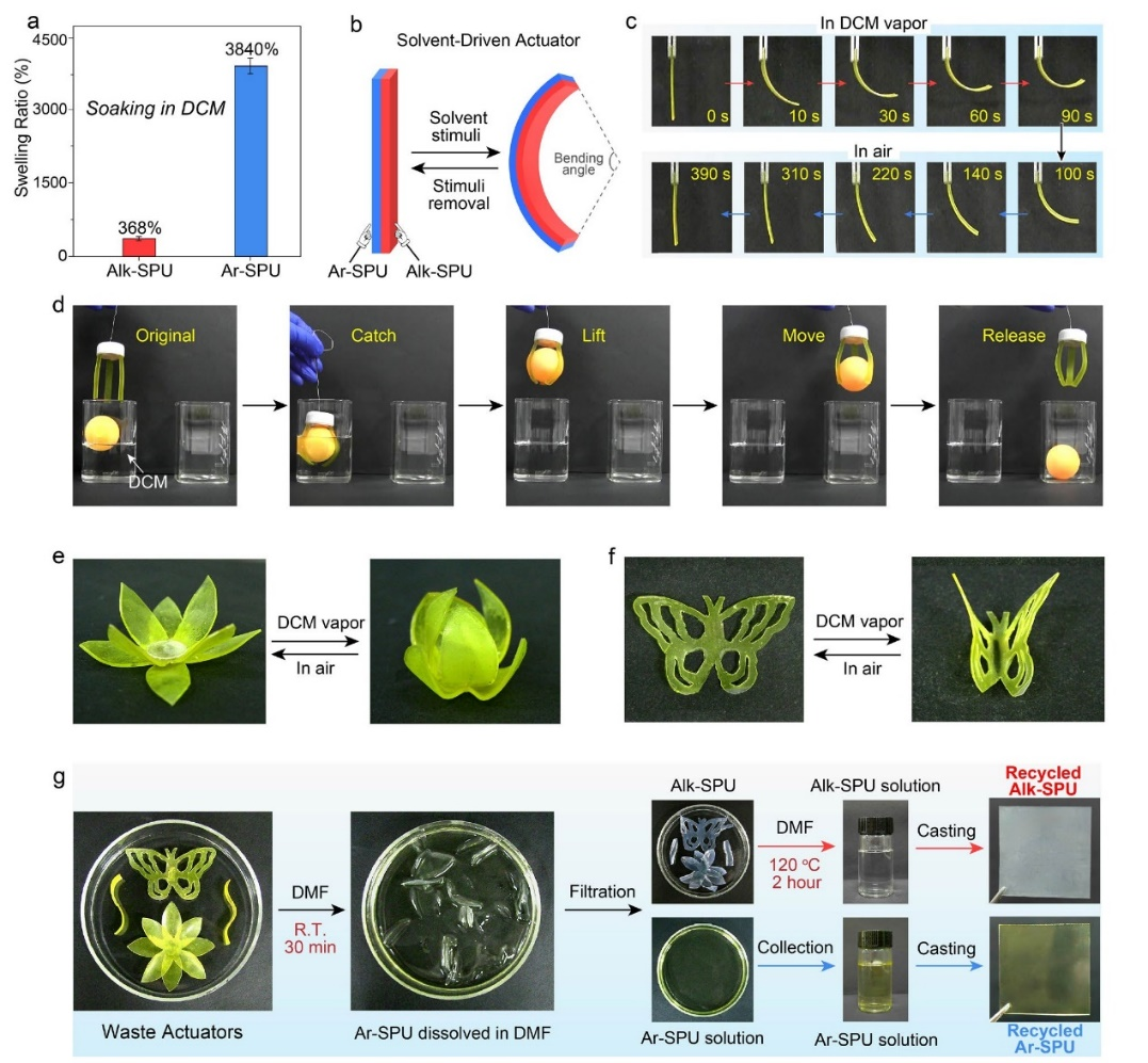作者利用Alk-SPU和Ar-SPU在有机溶剂中溶胀比的差异,制备了对溶剂具有刺激响应行为的双层驱动器。同时,由于Alk-SPU和Ar-SPU在高极性溶剂中溶解性的差异,所制备的溶剂响应型驱动器可以实现Alk-SPU和Ar-SPU的分离和回收。