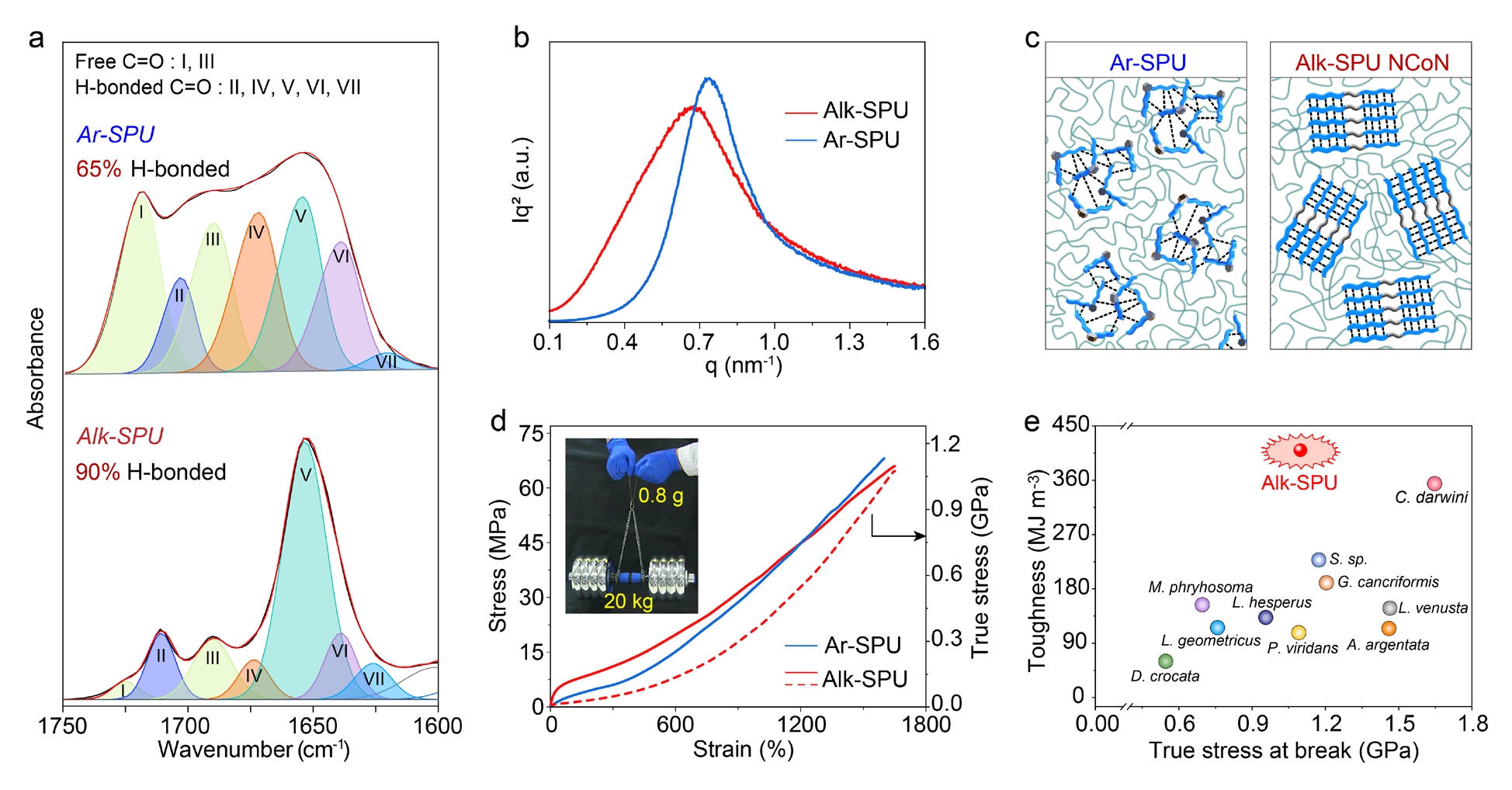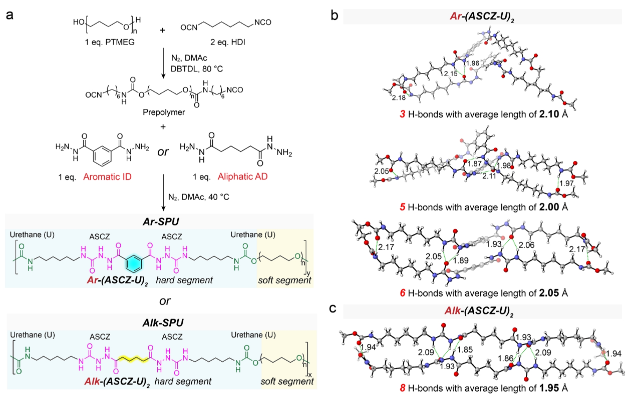 为了构建NCoN,作者合成了一种聚氨酯聚合物Alk-SPU,其硬段(Alk-(ASCZ-U)2)由两个酰基氨基脲(ASCZ)和两个氨基甲酸酯(urethane,U)基团通过高度柔性的线性烷基间隔基连接形成。作为对比,作者还合成了ASCZ基团之间的间隔基为刚性苯环的聚合物Ar-SPU。