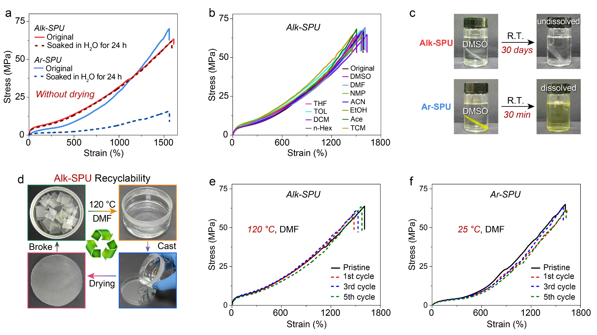 Alk-SPU具有极佳的耐水性,在水中浸泡24小时后,其力学性能几乎保持不变。同时,Alk-SPU具有类似共价交联网络的耐溶剂性,在高极性溶剂(如DMSO)中浸泡30天或在100 °C高极性溶剂中浸泡均不溶解,且可在干燥后恢复其力学性能。Alk-SPU可溶解在>120 °C的高极性溶剂中,进而实现重塑和循环利用。