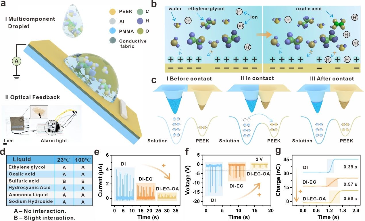 基于聚芳醚酮的摩擦起电探针用于检测多组分溶液动态变化的示意图。