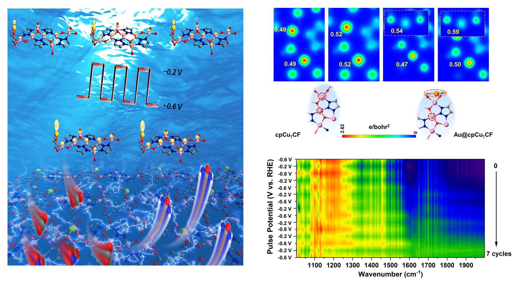 苏忠民教授/刘靖尧教授、华南师范大学兰亚乾教授团队合作构建了一个动态系统,能够精确控制催化位点的电荷密度分布,从而调节电合成尿素的多个连续步骤,实现高效的尿素合成。研究者们将Au 原子嵌入到共面的Cu7II簇基三维框架中(Au@cpCu₇ CF),打破了原始cpCu₇ CF 的电荷对称性。在动态条件下,随着脉冲电位在−0.2 V 和−0.6 V(相对于可逆氢电极)之间切换,Au@cpCu₇ CF 中Au 和Cu 原子之间的不对称电荷分布程度发生了周期性的动态变化。这种动态可控的电荷振荡能够调节电合成尿素中的多个连续步骤。理论计算结果表明,Au@cpCu₇ CF 的表面电荷密度对施加的电位具有强的响应性。当电位切换至−0.6 V 时,具有高电荷密度的Au 原子增强了对*HNO₂ 和*NH₂ 中间体的吸附,从而抑制了副产物生成路径;在−0.2 V 的低电位下,Au 和Cu 原子位点之间的电荷分布促进了热力学C–N 耦合。研究人员探讨了不对称电荷分布的动态调控在尿素电合成中的重要作用,为未来动态电催化研究提供了参考。相关研究成果近期发表在了Adv. Mater.杂志(Adv. Mater. 2024, 2408510)。