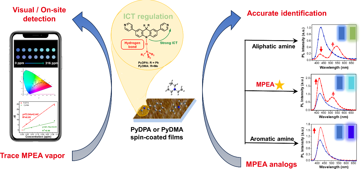 的张明团队设计开发了一种非接触式荧光探针该探针通过比率型和多模式荧光响应实现了冰毒及其模拟物MPEA蒸气的快速视觉检测和准确识别。该研究在设计上受前期工作启发:二苯基吖啶为识别位点的荧光探针可以与胺形成不同强度的氢键,引起一级胺、二级胺与三级胺的差异化的响应(Adv. Funct. Mater.2023, 33, 2212980),因此有望将检测范围缩小至MPEA所属的二级胺。通过调控受体基团,该工作得到一组在聚集态下具有激基缔合物(excimer)特征发光的荧光探针。研究结果表明,这一独特的激发态特性赋予了探针多模式响应的能力,实现了基于单探针的简单、高效的传感器阵列。其中MPEA表现出不同于其他化合物的独特的双峰增强响应和青色的荧光发射。此外,该工作首次将氢键诱导的ICT调控机理引入MPEA的检测,实现了高对比度的颜色变化和裸眼可视的检测。