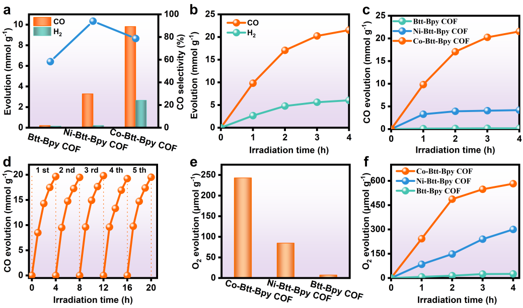 使用紫外-可见漫反射光谱和莫特-肖特基曲线确定了合成COF的能带结构。三种COF都表现出优异的可见光响应,并且均满足光催化CO2还原和水氧化电位。与Btt-Bpy和Ni-Btt-Bpy COF相比,Co-Btt-Bpy COF具有出最大的瞬时光电流密度和最小的电化学阻抗。这证明在光催化过程中,Co-Btt-Bpy COF表现出最小的电子转移阻力和最快的界面电荷传输。此外,Co-Btt-Bpy COF中丰富电子的苯并噻吩部分(HOMO)可将光生电子快速转移到缺电子的联吡啶基团(LUNO)中Co位点。因此,D-A COF 可确保光生电子-空穴对的有效分离并促进分子内电荷转移。这为光催化CO2还原和H2O氧化提供了巨大的潜力(图三)。
