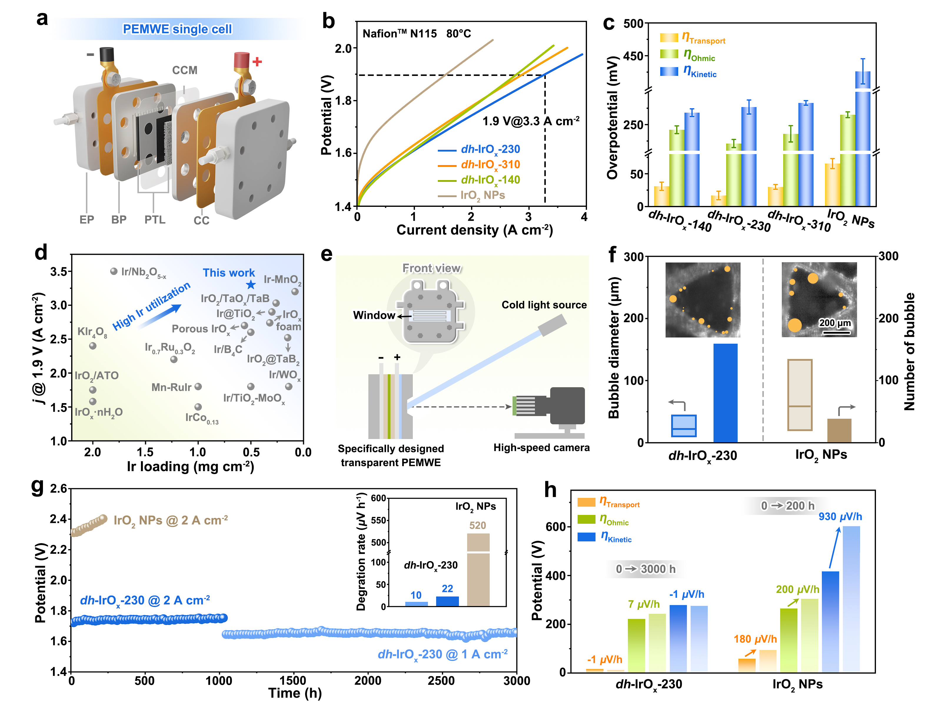 低铱载量的dh-IrOx催化层结构既能最大化电化学活性表面积,又能有效抑制颗粒迁移与团聚,同时形成贯通的电子传输网络与物质传输通道。所构筑的阳极催化层在低铱载量(0.3-0.5mgIr/cm2)、Nafion™ N115膜条件下,3.3 A cm⁻²电流密度仅需1.9 V,展现出极高的电解水性能(图3)。同时,在3000小时的长期运行后,电压衰减小于1.5%,稳定性比传统IrO₂纳米颗粒提高至少20倍。