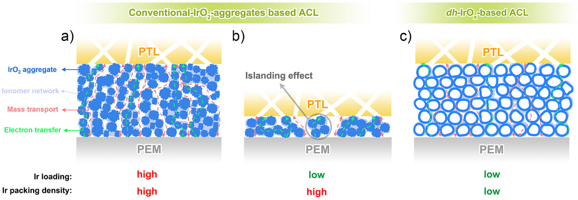 邹晓新教授团队在质子交换膜水电解槽(PEMWE)阳极铱基催化剂研发领域取得重要进展。降低铱堆积密度是减少阳极催化层铱载量的关键途径,然而通常面临结构稳定性低、电子/物质传输效率受限等问题。团队提出空心氧化铱纳米球(dh-IrOx)制备阳极催化层,将阳极铱堆积密度降低至传统IrO2纳米颗粒的20%,并在低铱载量下展现出优异的催化活性和耐久性。相关成果以"Highly Efficient and Durable Anode Catalyst Layer Constructed with Deformable Hollow IrOxNanospheres in Low-iridium PEM Water Electrolyzer"为题,于3月12日发表于Angewandte Chemie上。