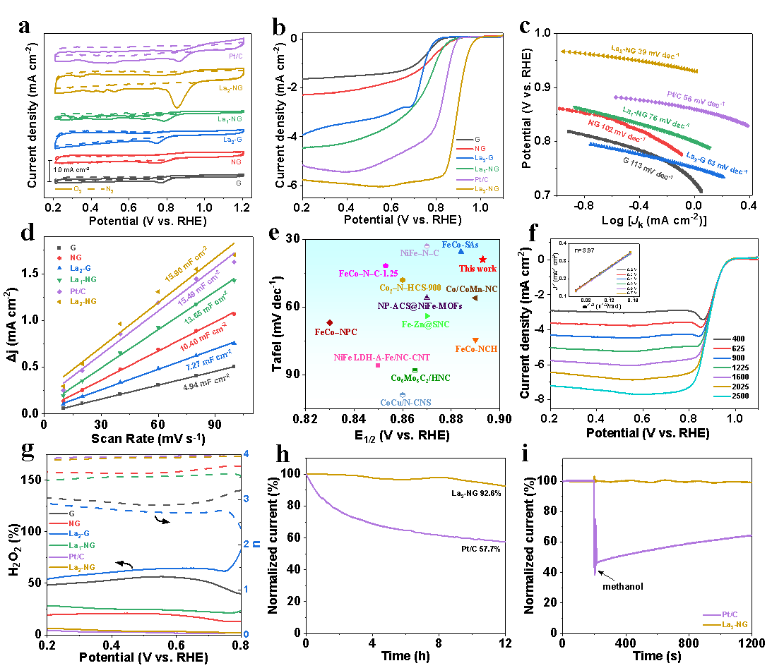 管景奇教授团队利用主客体封装策略构建了具有La2-N6结构的双原子La催化剂(La2-NG)。利用该技术构建的La2-NG的氧还原反应(ORR)活性高于商业Pt/C,半波电位为0.893 V,将其作为空气阴极组装的锌空气电池(ZAB)表现出优异的催化性能和稳定性。发现了氧化还原过程中La价态的变化和嵌入石墨烯的La2-N6结构的动态演化,从而可以合理地调节氧还原中间体的吸附/脱附,并且La2-N6结构可以降低反应能垒,促进电荷转移。该研究成果以“A Dual-Atom La2Catalyst for the Oxygen Reduction Reaction”为题,于6月25号发表在Angew. Chem. Int. Ed.期刊上。