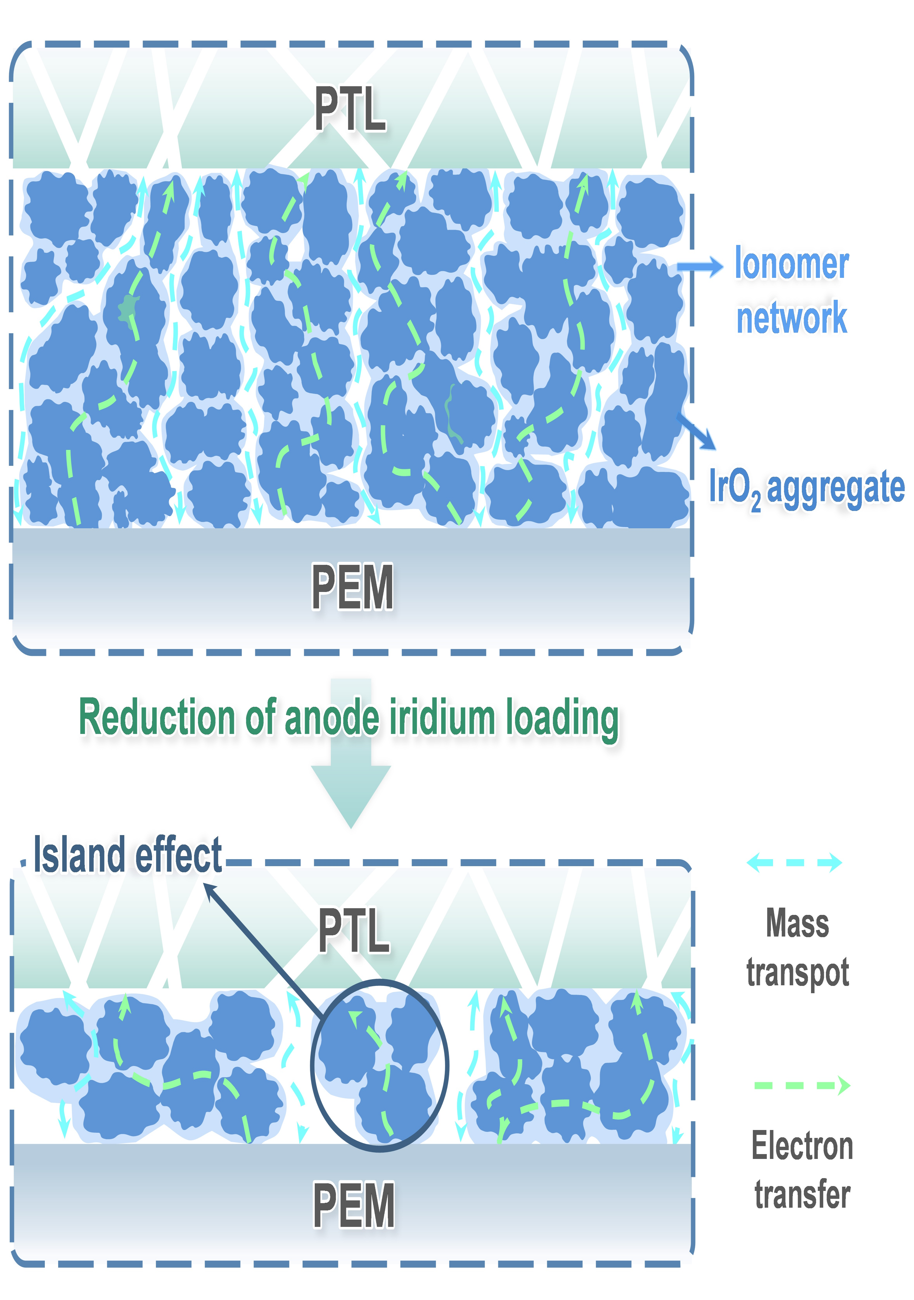 本文系统解析了PEMWE阳极催化层的功能构成(图1),包括催化反应、电子传导、质子传输及水/氧等分子的扩散。在强酸性、高电压、大电流密度和气液交替的极端运行条件下,催化剂不仅需具备高活性与高稳定性,还必须实现电子、质子与反应分子的高效协同传输。传统氧化铱体系依赖高载量维持性能,显著制约其低铱化潜力。铱负载降低易引发“孤岛效应”,造成电子传导不连续、电流分布不均,加剧催化剂团聚与失活。