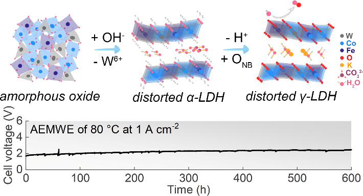 李广社教授和李莉萍教授团队通过高氧化态掺杂策略,合成了一种W6+掺杂的Co-Fe非晶氧化物,实现了活性和稳定性的双重优化。W6+的引入使结构非晶化,引起电荷再分布,并改变了键合性质。这导致催化剂在工况下发生自发和电化学体相重构,完全演变为活性的γ-层状双金属氢氧化物结构。重构过程中,Co和Fe位点产生了局部结构的不均匀性,在电场作用下产生活性的非键氧态,触发晶格氧机理,降低了反应起始电位,实现了Co3+催化的析氧反应。随着电位的进一步提升,反应机理发生转变,由低电位下的晶格氧机理转变为高电位下的吸附演化机理。这一电位依赖性的机理转变使催化剂在阴离子交换膜水电解槽中以1.69V的槽压实现1000mA cm-2的电流密度并至少稳定运行600h。