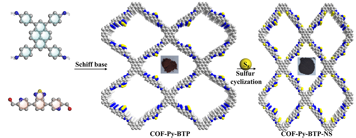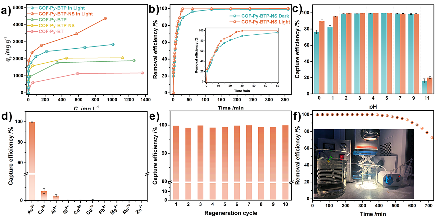 梁志强教授和宋晓伟教授课题组联合香港城市大学孙立波研究员,将吡啶单元引入5,5'-(苯并[c][1,2,5]噻二唑-4,7-二基)二吡啶醛的受体片段,并与芘基电子供体单元结合,构建出D−A型COF-Py-BTP。COF-Py-BTP中的吡啶单元通过与亚胺氮原子形成配位位点捕获金离子。此外,进一步通过将可逆亚胺连接的COF-Py-BTP转化为不可逆噻唑连接的COF-Py-BTP-NS,获得了一种高度共轭且超稳定的光辅助金捕获材料。与COF-Py-BTP相比,COF-Py-BTP-NS不仅具有更快的电子分离和转移能力,而且通过引入硫原子提高了金捕获效率。在光照条件下,COF-Py-BTP-NS的Au(III)捕获容量显著提升至4374 mg g–1,优于众多的金吸附材料,同时对于众多的干扰离子具有优异的吸附选择性,并在多次循环中保持稳定。DFT计算证明了噻唑链接的COF-Py-BTP-NS具有更低的金吸附能量。COF-Py-BTP-NS对于实际电子废弃物同样具有优异的金回收效率,填充柱实验证明了其在光照下对于电子废弃物中的金提取具有长时的高选择性与回收率。