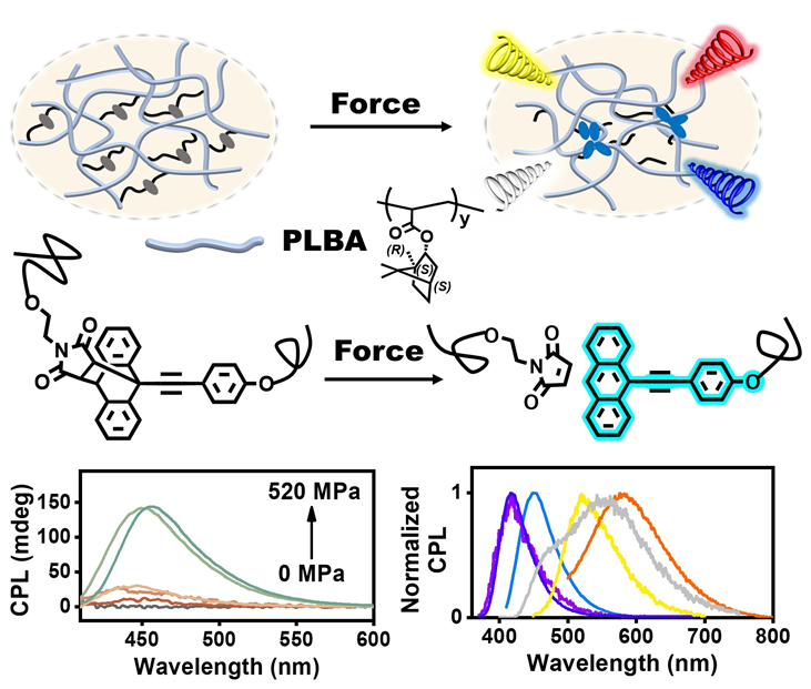 智能光学材料领域近年来蓬勃发展,其中,力诱导荧光高分子通过将力敏团共价嵌入高分子主链,能够在应力作用下发生化学转化,实现荧光颜色或强度的变化,从而在分子尺度上探测材料损伤。这类材料因其响应的发光信号具有高灵敏度和高时空分辨率的优势,已成为研究热点。然而,光的另一个关键维度——偏振,尤其是圆偏振发光(Circularly Polarized Luminescence, CPL),在高分子力化学研究中长期未被充分探索。CPL作为手性光源,在手性传感、3D显示、信息加密与生物探针等领域潜力巨大。尽管已有研究通过物理刺激(如研磨、溶剂)调控CPL,但这些方法普遍存在手性信号稳定性差、难以集成于固态膜材料等问题。更为关键的是,如何利用机械力这一直接且普适的外界刺激,主动产生并精准调控CPL信号,仍是一个亟待解决的难题,制约了人们对力与手性相互作用机制的深入理解,也限制了高性能智能光学材料的进一步发展。