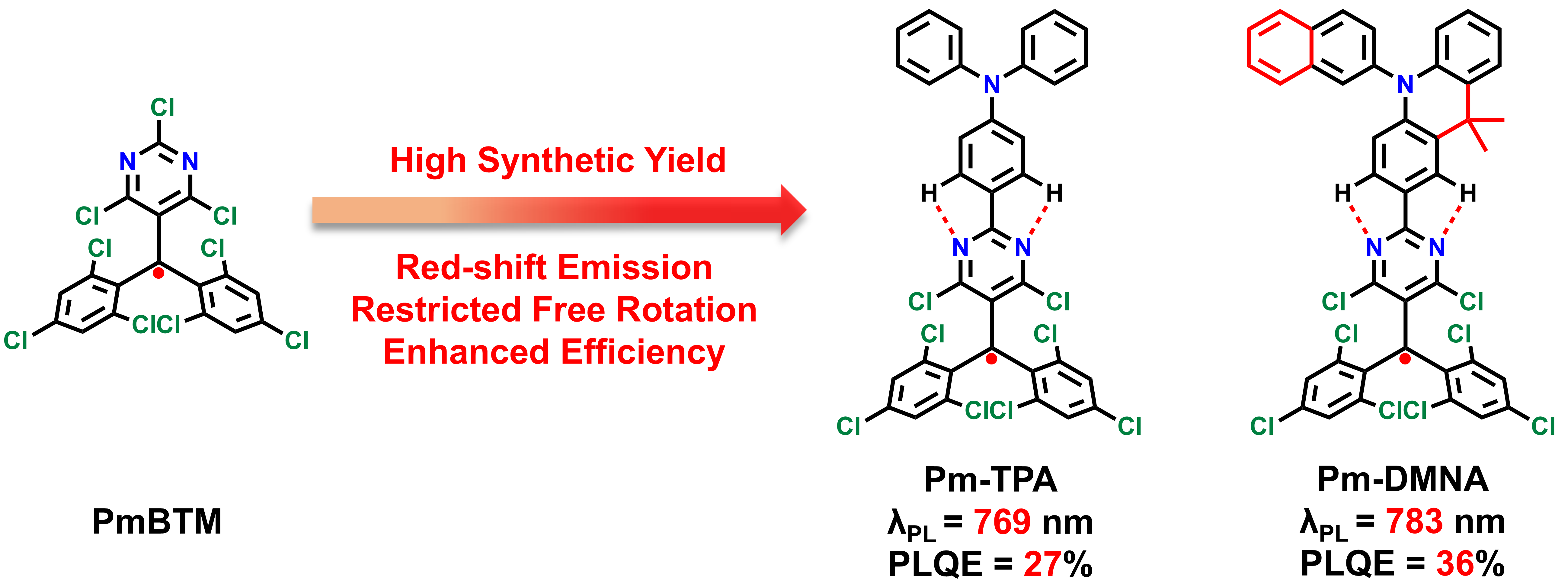 有机近红外(NIR)光源因其在可穿戴电子设备、生物治疗和传感器方面的潜在应用而备受关注。然而,在NIR波段实现高外量子效率(EQE)仍是一项艰巨的挑战。NIR发光材料的研究长期受到“能隙定律”的限制,即随着能隙变窄,材料会表现出极强的振动-发光耦合,导致非辐射跃迁快速增加,从而使发光效率迅速下降。迄今为止,只有少数研究在近红外区域(>800 nm)实现了超过4%的EQE。自由基因其独特的双线态发光机制而备受关注。然而,实现高效率NIR发射仍然极具挑战:一方面,现有自由基分子骨架类型有限且合成路线冗长;另一方面,扭曲的给受体构型引发的振动会显著增强非辐射跃迁途径,严重制约发光效率。因此,开发兼具高稳定性、高产率与高发光效率的新型NIR发光自由基体系,是当前有机自由基材料研究的重要方向。