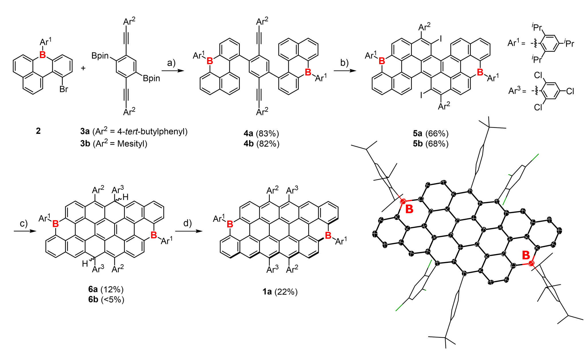 图1.(a)锯齿边缘纳米石墨烯的杂原子掺杂方法;(b)硼杂纳米石墨烯双自由基的分子设计、化学结构和自旋密度图