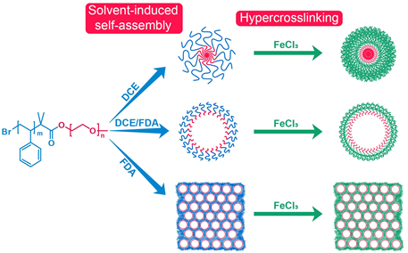 乔振安教授课题组设计合成了两亲性嵌段共聚物聚乙二醇-聚苯乙烯(PEO-b-PS),通过溶剂诱导嵌段共聚物自组装的方法合成了具有多级孔结构的超交联聚合物。与前人的工作不同,该方法创造性地把模板剂与前驱体结合在一起,用嵌段共聚物PEO-b-PS在甲缩醛与1,2-二氯乙烷混合溶剂中形成的胶束作为反应的“单体”,通过交联反应将不稳定的胶束转化为稳定的超交联聚合物。而通过调节胶束的组装状态,就可以改变所得到产物的形貌。