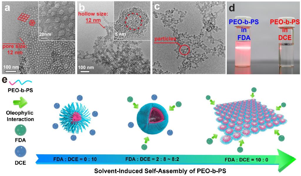 图2 a. 当FDA:DCE体积比为10:0时产物的TEM照片 b. 当FDA:DCE体积比为2:8时产物的TEM照片 c. 当FDA:DCE体积比为0:10时产物的TEM照片 d. PEO-b-PS在不同溶剂中形成的体系的照片 e. 溶剂诱导自组装法的机理示意图