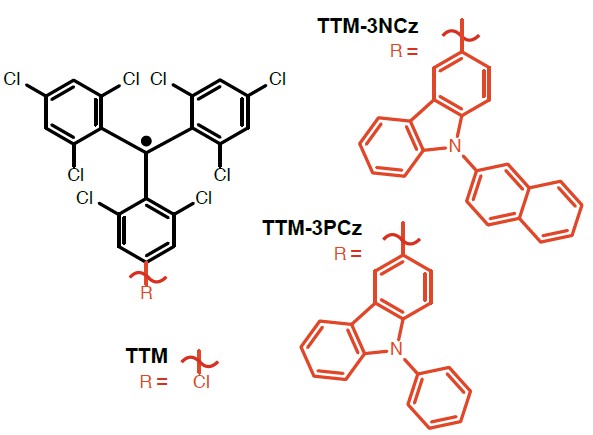 在前期研究的基础上,教授研究团队以TTM自由基作为核心,以PCzNCz两个咔唑衍生物作为给体(Donor),得到了两个高效的电荷转移态(CT)红光自由基TTM-3NCzTTM-3PCz(如图2所示)。这种Donor-Radical结构的分子设计大幅提高了发光自由基分子的稳定性以及发光效率,两个分子甲苯溶液中的光致发光效率分别达到49%46%,其掺杂薄膜的光致发光效率分别达到90%61%