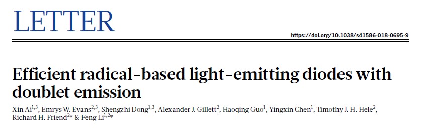 1122日,《Nature》杂志刊发了第一会所 、超分子结构与材料国家重点实验室教授研究团队和剑桥大学卡文迪许实验室(Cavendish LaboratoryRichard H. Friend教授研究团队合作论文“高效双线态自由基发光二极管”(Efficient radical-based light-emitting diodes with doublet emission, Nature, 2018, 563, 536-540),第一会所 为第一完成单位。