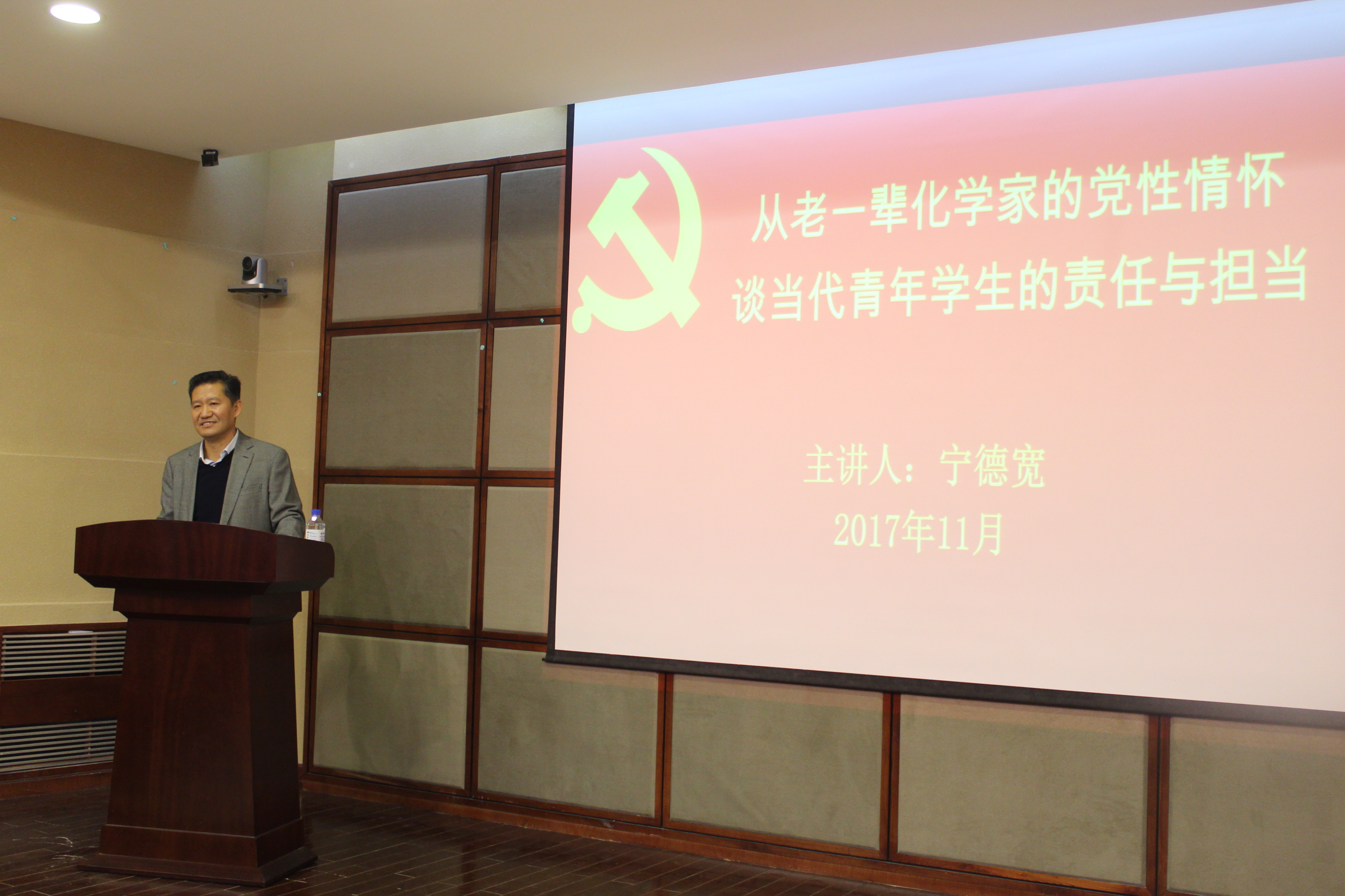 党委书记宁德宽老师以《从老一辈化学家的党性情怀谈当代青年学生的责任与担当》为题为学生党员讲授党课。