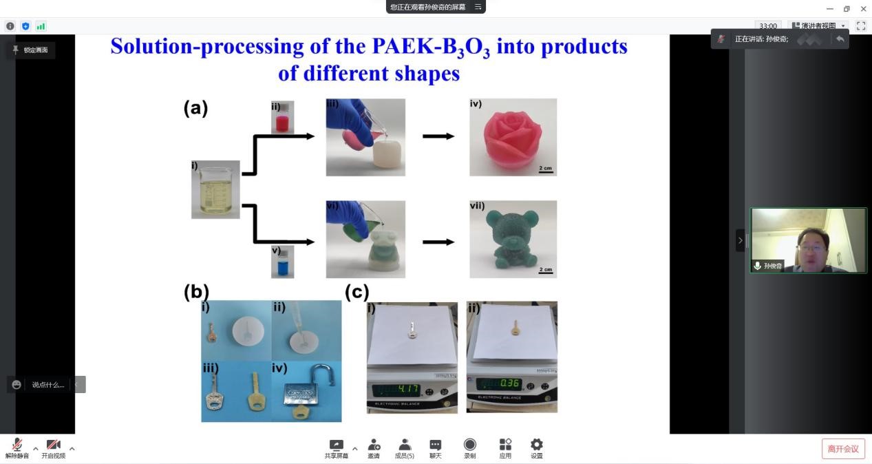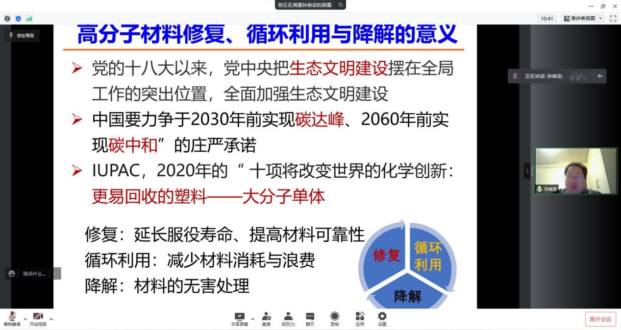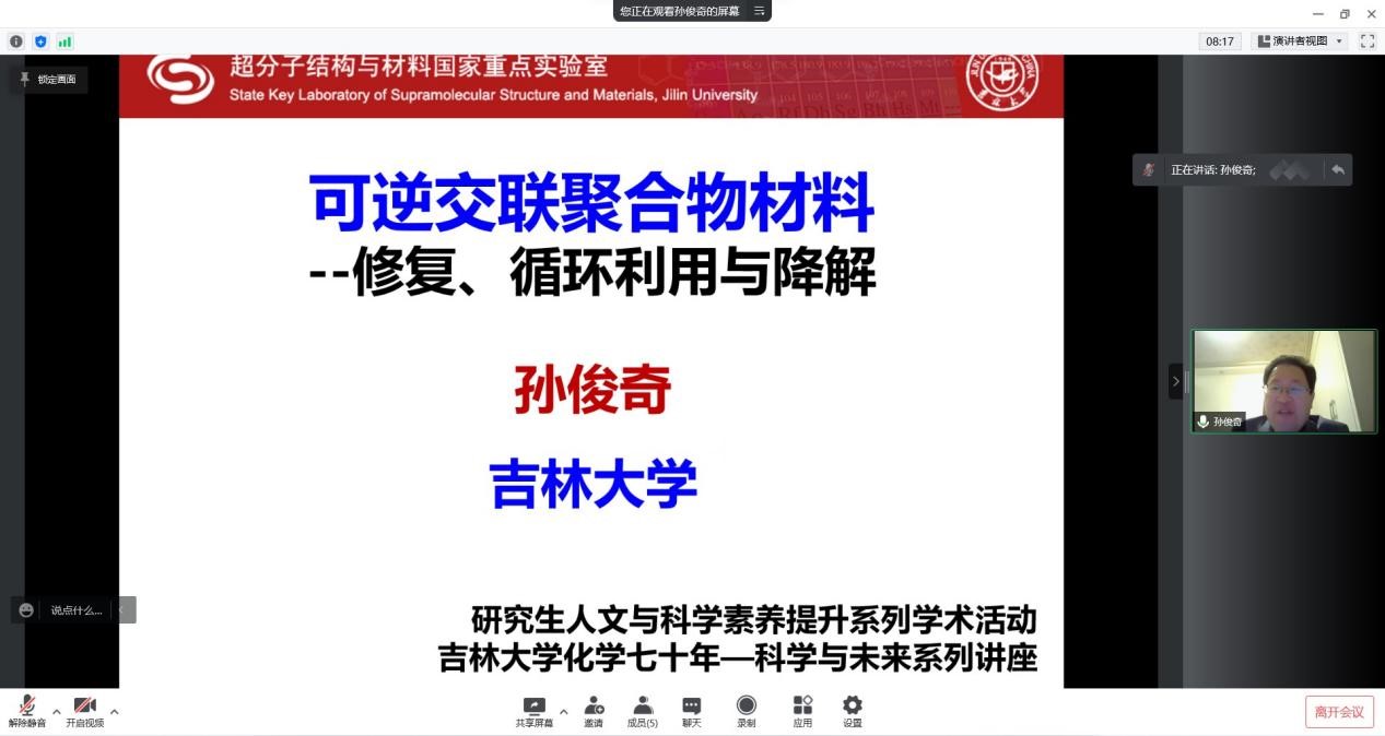 3月27日上午,我院举办了“吉大化学70年院庆系列活动—科学与未来系列讲座”,本期讲座邀请了孙俊奇教授作主题为“可逆交联聚合物材料:修复、循环利用与降解”的线上学术报告。