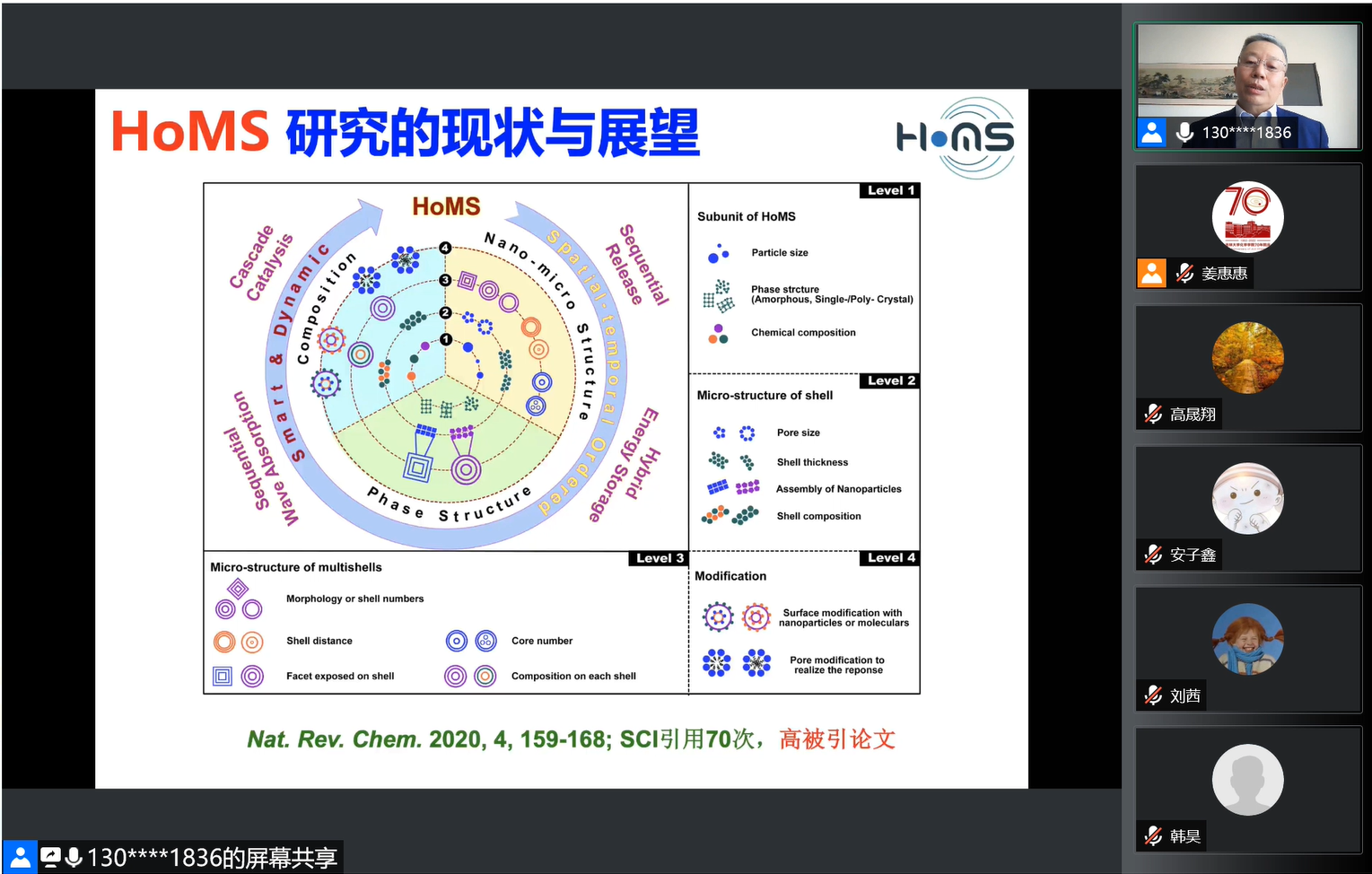 讲座中,王丹研究员围绕中空多壳层结构的合成化学与独特属性,深入浅出地分享了其研究团队所提出的用于中空多壳层结构可控合成的次序模板法,实现了对壳层结构的精准调控;介绍了中空多壳层结构独特的时空顺序新属性,展示了这类材料的应用范围。在交流互动环节,王丹研究员耐心详细地解答了院内外师生的问题,并对相关领域的发展作出了展望。第一会所 、无机合成与制备化学国家重点实验室、超分子结构与材料国家重点实验室等单位负责人参加讲座,院内外400余名师生在线收看。