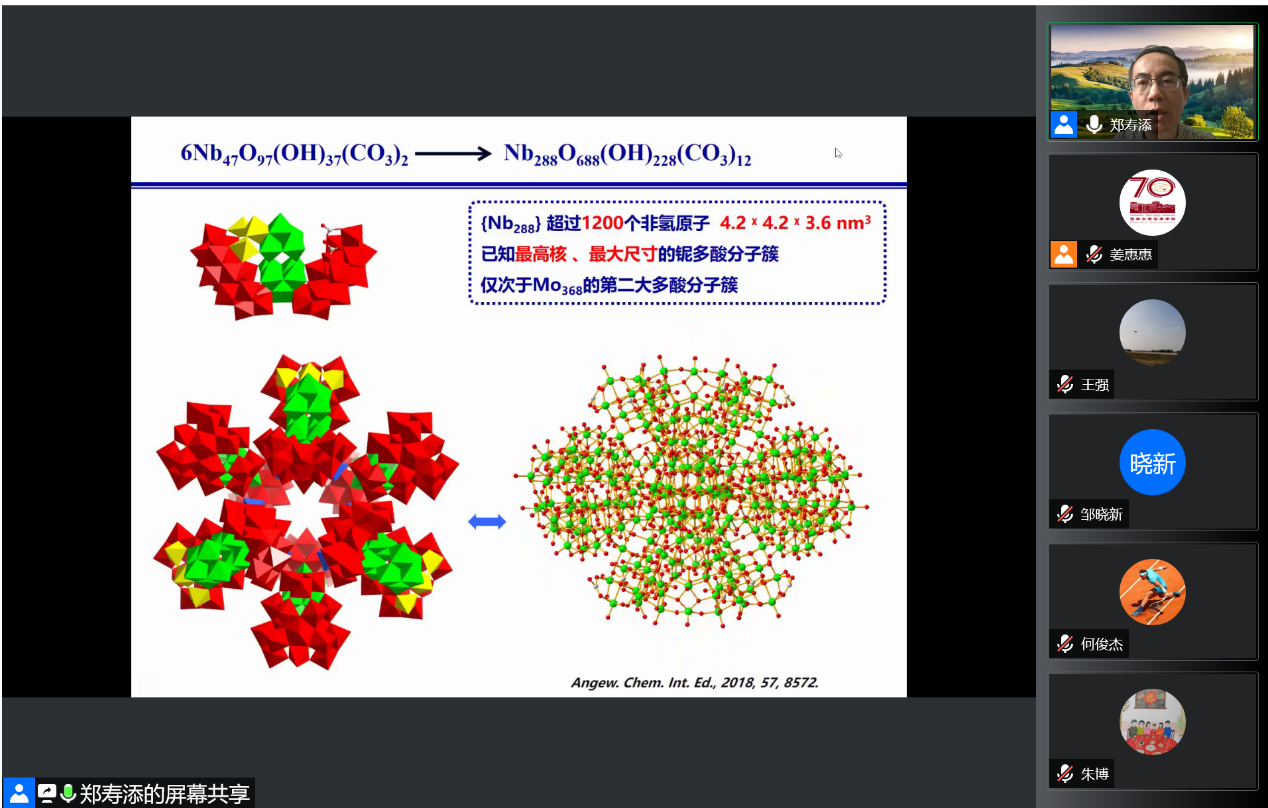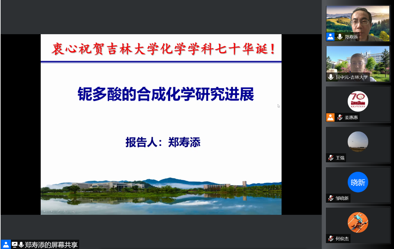 院长,教育部领军人才郑寿添应邀线上做客“吉大化学七十年——科学与未来系列讲座”,以“铌多酸的合成化学研究进展”为题,为学院师生作学术报告。
