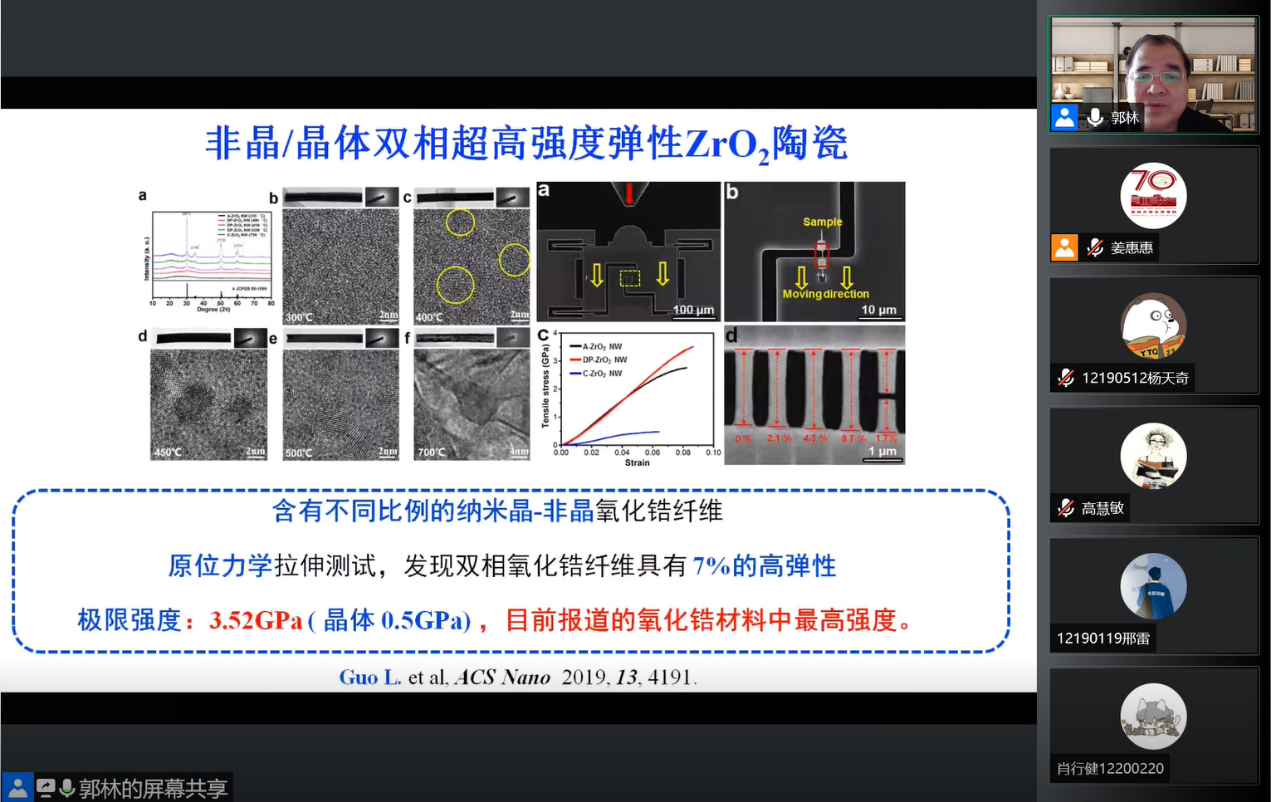 讲座中,郭林教授围绕无机非晶微纳米材料的可控合成及相关特性深入浅出地分享了其课题组在非晶微纳米材料普适制备方法,无机非晶微纳米材料光学特性、催化特性,非晶微纳米材料的力学特性及其在牙修复中的应用等方面的研究进展,展现了无机非晶微纳米材料的研究前沿及广阔的应用前景。在交流互动环节,郭林教授耐心详细地解答了院内外师生的问题,并对相关领域的发展出了展望。第一会所 、无机合成与制备化学国家重点实验室、超分子结构与材料国家重点实验室等单位负责人参加讲座,院内外200余名师生在线收看。
