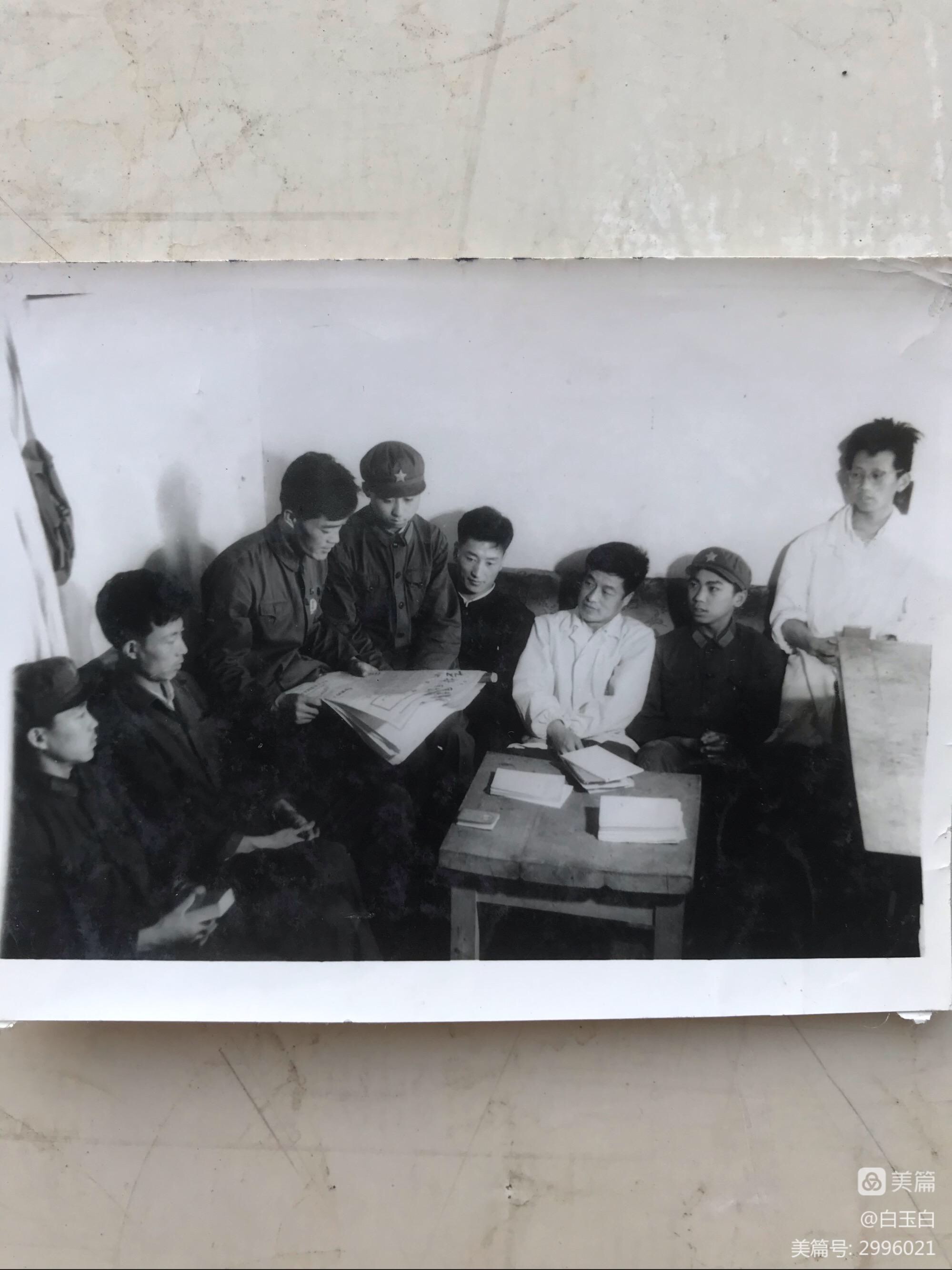 图3:404课题组人员:【赵方卿】、白玉白(左三)、汤国庆、【杨光弟】、王顺祥和军代表一起政治学习(注:【】者已离世)